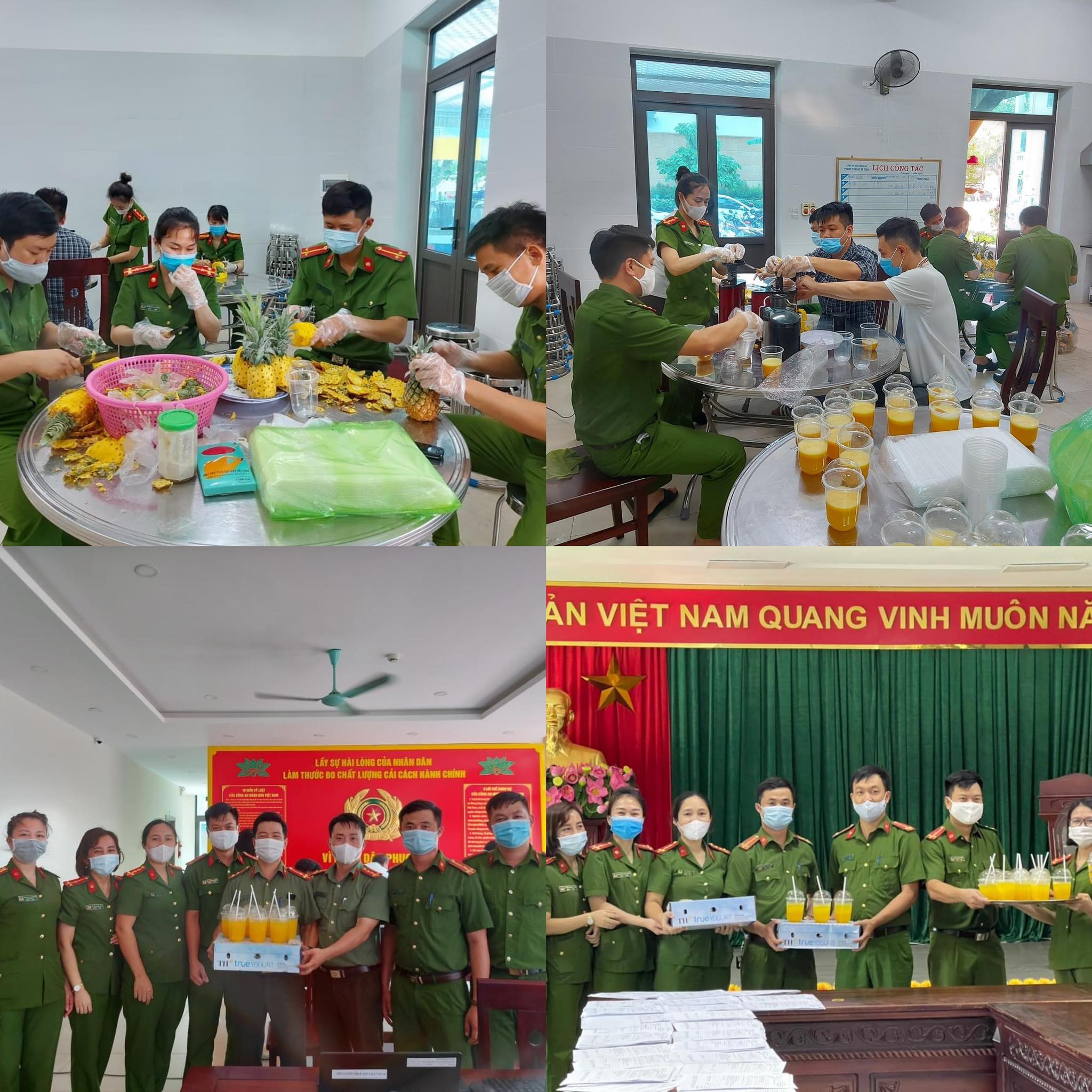 Đoàn viên thanh niên chi đoànpphòng cảnh sát QLHC về TTXH tổ chức làm nước ép hoa quả và chuẩn bị một số phần quà để tặng cho các tổ làm căn cước công dân tại bộ phận một cửa Công an tỉnh, đội tàng thư căn cước công dân và các tổ làm CCCD lưu động trên địa bàn thành phố Vinh và địa bàn huyện Diễn Châu.
