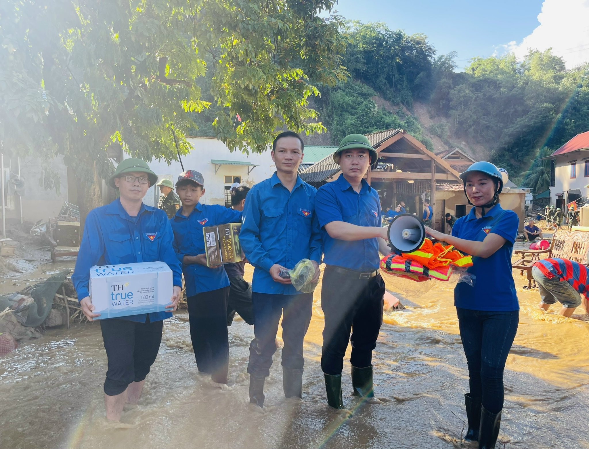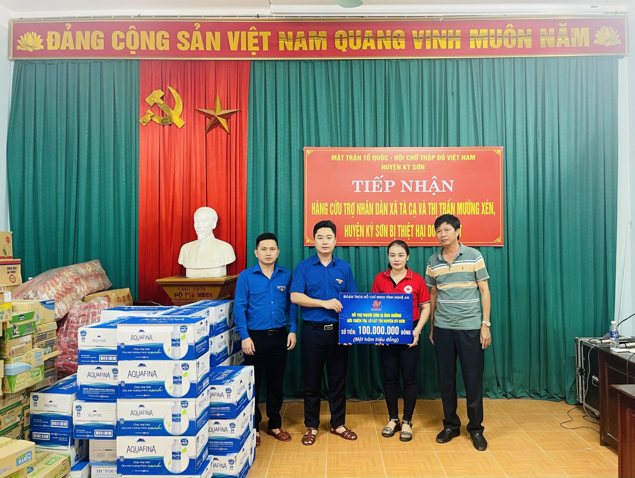 Đoàn đã đến tặng quà, động viên Đội Thanh niên xung kích đang tham gia các hoạt động khắc phục thiên tai lũ lụt tại huyện Kỳ Sơn gồm áo phao, loa tay, đèn pin, còi cứu hộ, ủng, áo mưa phản quang...