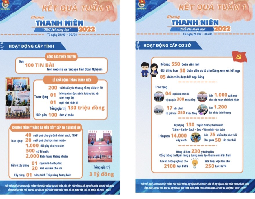 Những kết quả nổi bật của tuần đầu ra quân Tháng Thanh niên đã cho thấy khí thế sôi nổi, sự ra quân đồng loạt của cấp bộ Đoàn toàn tỉnh. Inforgraphic: Tỉnh đoàn Nghệ An