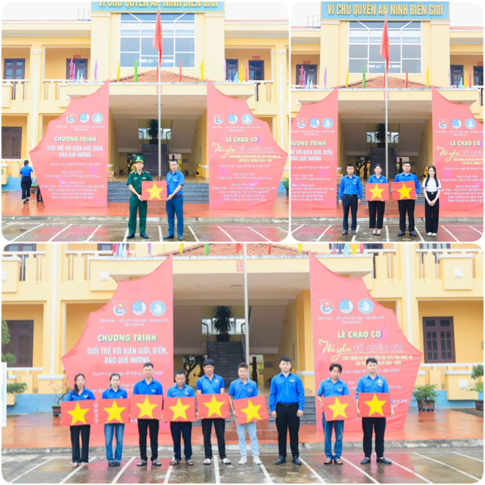 Đại diện Ban Thường vụ Huyện đoàn Anh Sơn, Đoàn trường CĐ Kỹ thuật công nghiệp Việt Nam - Hàn Quốc, Đoàn trường CĐ Việt Đức, Đoàn trường Đại học Kinh tế Nghệ An trao cờ Tổ quốc cho các đơn vị