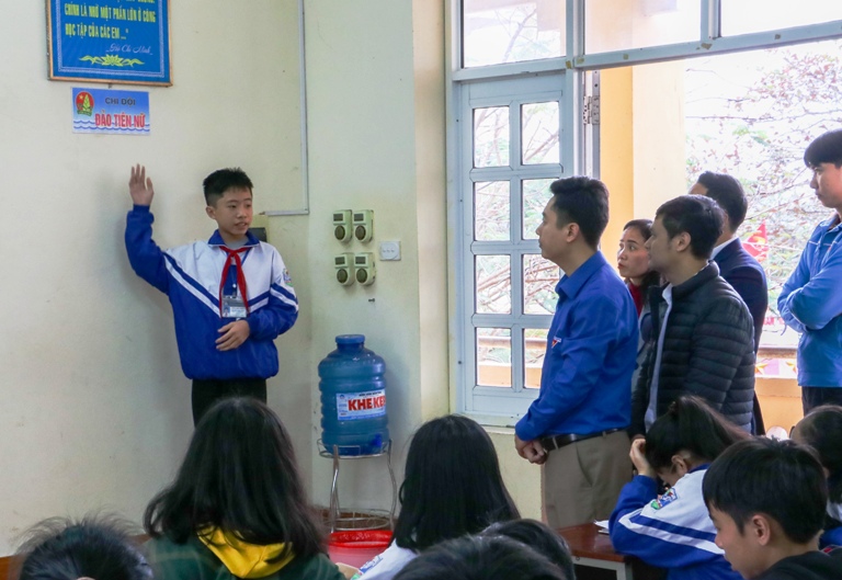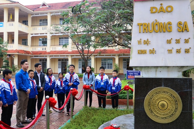 Trao đổi với đoàn công tác, thầy Nguyễn Vương Linh - Hiệu trưởng nhà trường cho biết, năm học 2015 – 2019, Liên đội nhà trường có đề xuất với Ban Giám hiệu về ý tưởng đặt tên cho các chi đội theo tên các đảo thuộc quần đảo Trường Sa nhằm gợi lên tình cảm của đội viên, học sinh với Tổ quốc, quê hương và cũng là cách giúp các em bổ sung kiến thức về biển đảo Việt Nam. Xác định công tác giáo dục lý tưởng cách mạng, đạo đức, lối sống văn hóa là một quá trình dài, cần thiết phải được thực hiện ngay từ nhà trường, ý tưởng này đã được Ban Giám hiệu đồng ý ngay và chỉ đạo thực hiện. Mỗi phòng học của mỗi chi đội đều được gắn thêm biển tên mới. Đó là những Trường Sa, Sinh Tồn, Tiên Nữ, An Bang, Sơn Ca…