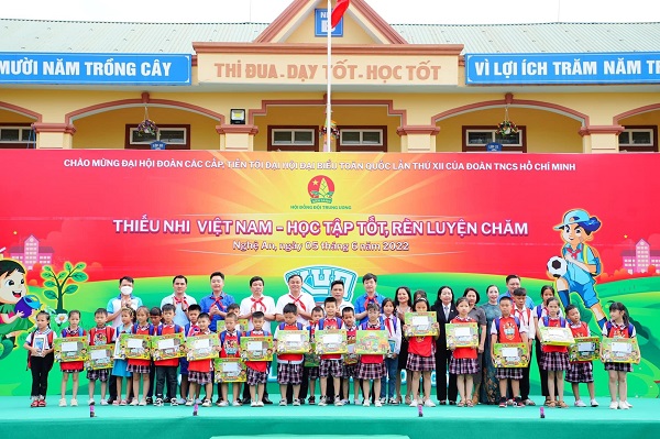 Nhân dịp này, Hội đồng Đội Trung ương và Hội đồng Đội tỉnh Nghệ An tặng 10 thiết bị học tập trực tuyến cho 10 em học sinh có hoàn cảnh khó khăn trên địa bàn tỉnh Nghệ An và 20 suất học bổng, quà tặng cho 20 em học sinh trường Tiểu học Nguyễn Trãi, mỗi suất trị giá 1 triệu đồng.