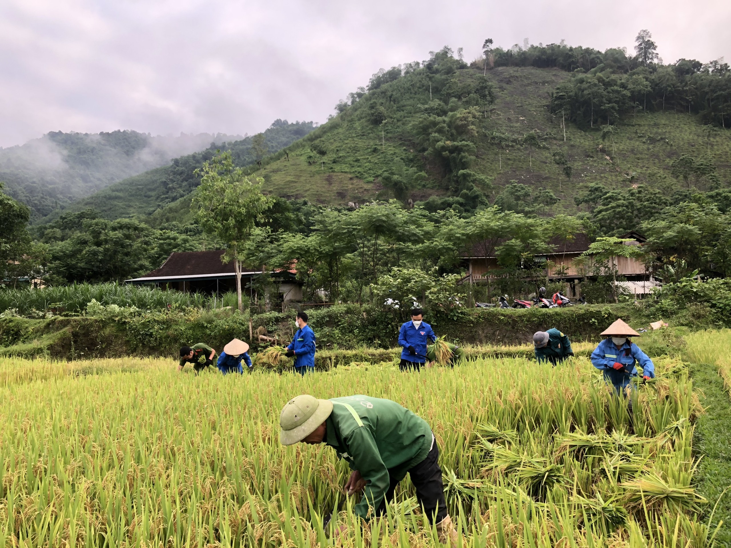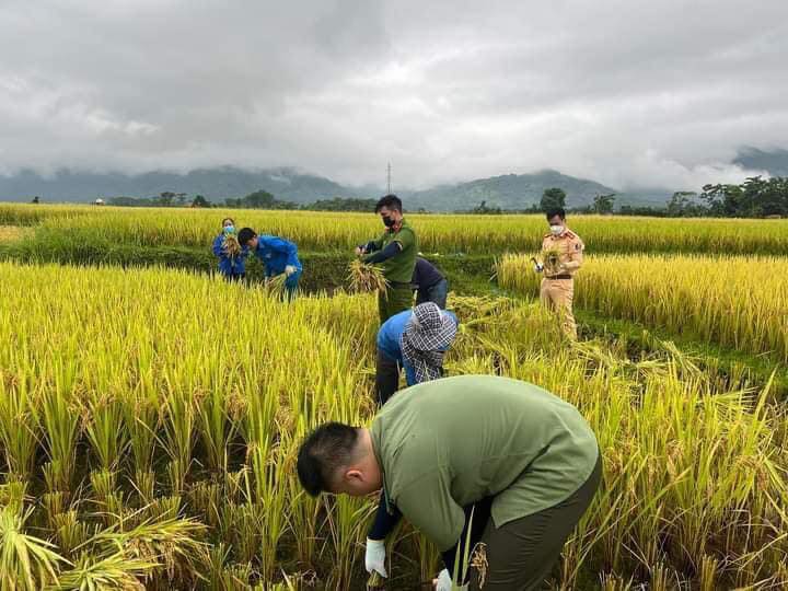 Tương tự, trước tình hình thời tiết diễn biến xấu, dự báo có mưa kéo dài, nhằm giúp các hộ gia đình kịp thời thu hoạch lúa vụ Đông Xuân, các chiến sỹ Công an huyện Quế Phong đã phối hợp với Đoàn xã Mường Nọc huy động cán bộ, chiến sỹ, đoàn viên xã nhà giúp đỡ những gia đình neo đơn, có hoàn cảnh khó khăn tại khu vực bản Thanh Phong 2 gặt lúa.