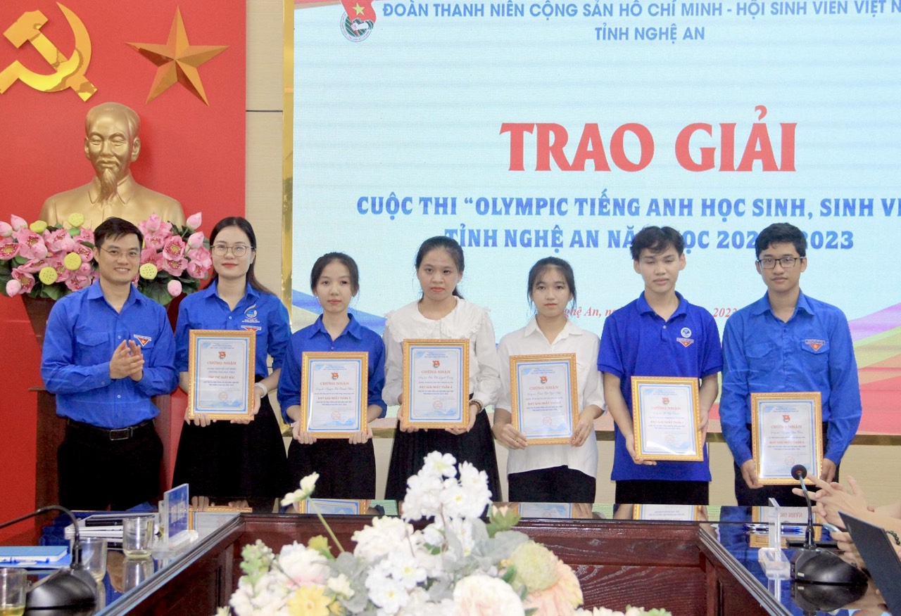 Đại diện Thường trực Hội Sinh viên tỉnh khen thưởng cho các cá nhân, tập thể đạt thành tích xuất sắc Cuộc thi “Olympic tiếng Anh học sinh, sinh viên” tỉnh Nghệ An năm học 2022 – 2023”.