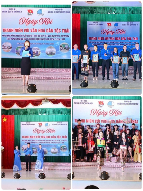 Ban Thường vụ Tỉnh đoàn - Ban Thư ký Hội LHTN Việt Nam tỉnh Nghệ An tổ chức Chương trình Ngày hội thanh niên với văn hóa dân tộc Thái năm 2024 tại huyện Quỳ Châu. Chương trình thu hút sự tham gia của 500 lượt đoàn viên, thanh niên.Trong dịp này Ban Tổ chức cũng đã trao vốn hỗ trợ xây dựng mô hình kinh tế cho đoàn viên thanh niên với tổng giá trị 100 triệu đồng; trao 2 phần quà cho già làng, người uy tín và 05 suất quà cho các em học sinh có hoàn cảnh khó khăn.