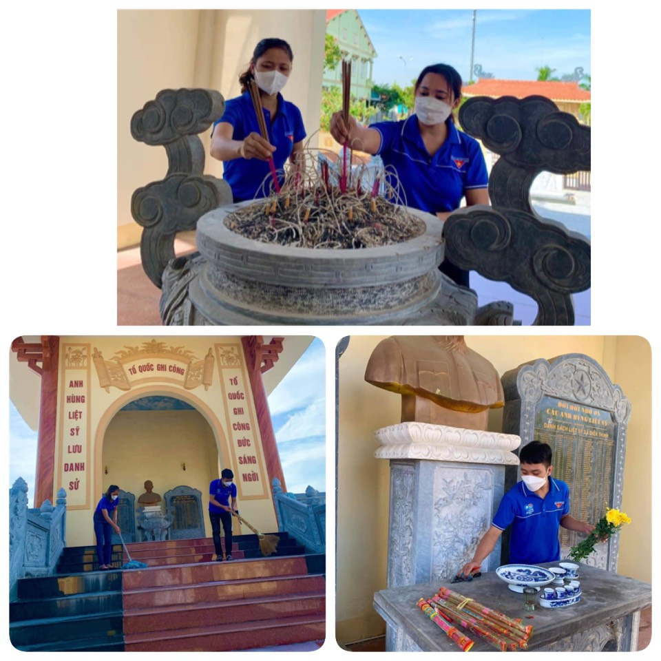 Đoàn viên thanh niên huyện Diễn Châu ra quân dọn dẹp vệ sinh và tổ chức dâng hương tại Nghĩa trang liệt sỹ trên địa bàn huyện. Ảnh: Huyện đoàn Diễn Châu