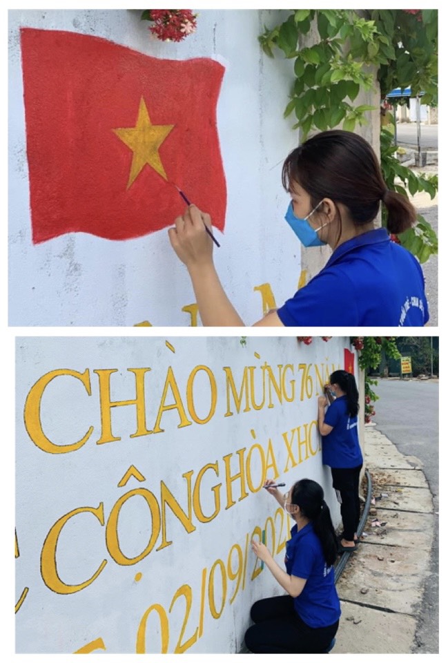 Vẽ con đường bích họa gắn với nội dung tuyên truyền kỷ niệm 76 năm Quốc khánh nước cộng hòa xã hội chủ nghĩa Việt Nam . Ảnh: Thị đoàn Hoàng Mai