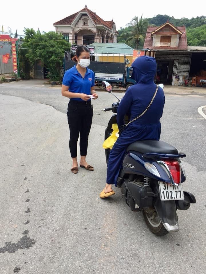 Hỗ trợ lực lượng chức năng trực tại các điểm chốt kiểm soát người ra vào địa phương. Ảnh: Thị đoàn Thái Hòa