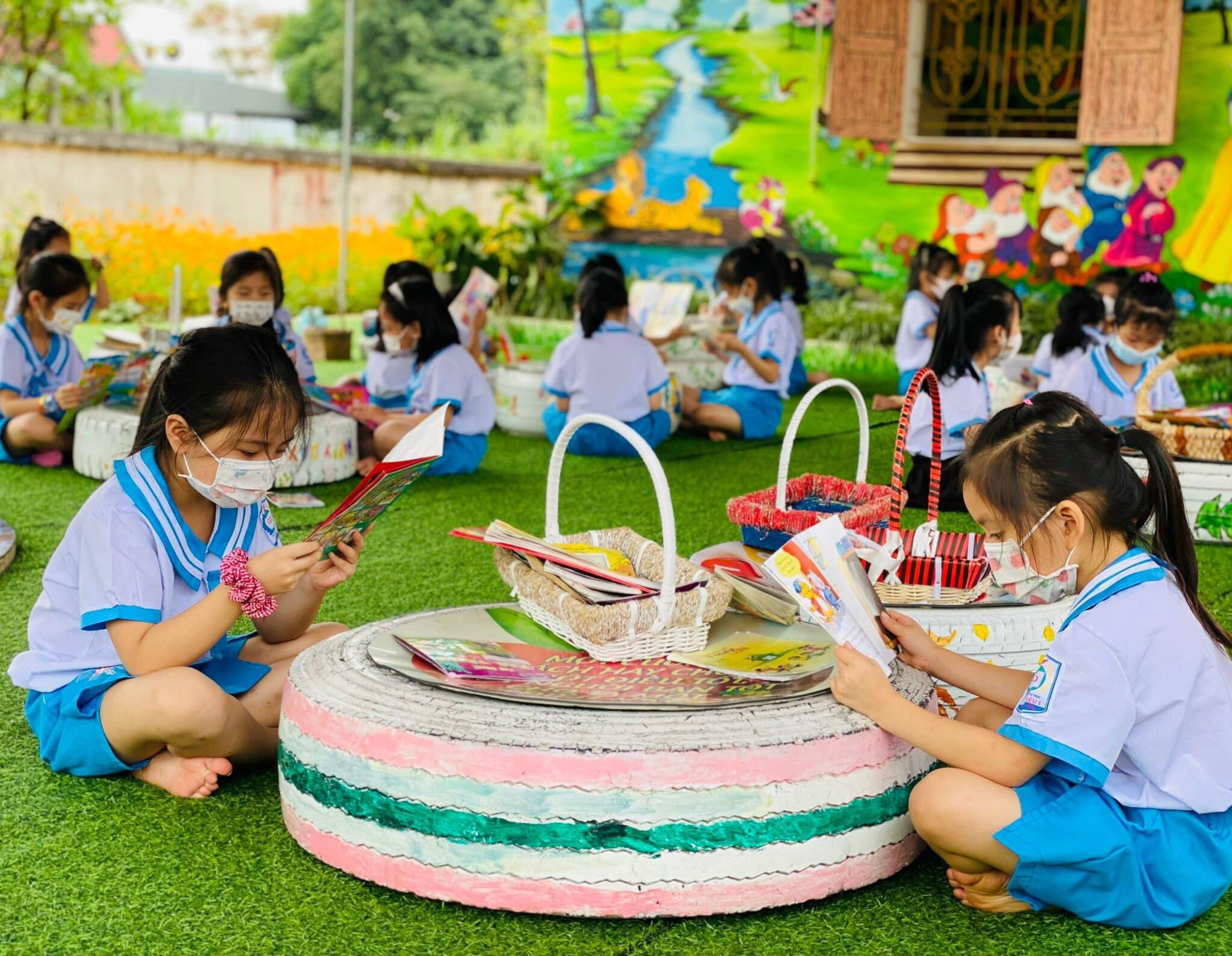 Tổ chức cho các em đọc sách ở thư viện trường.