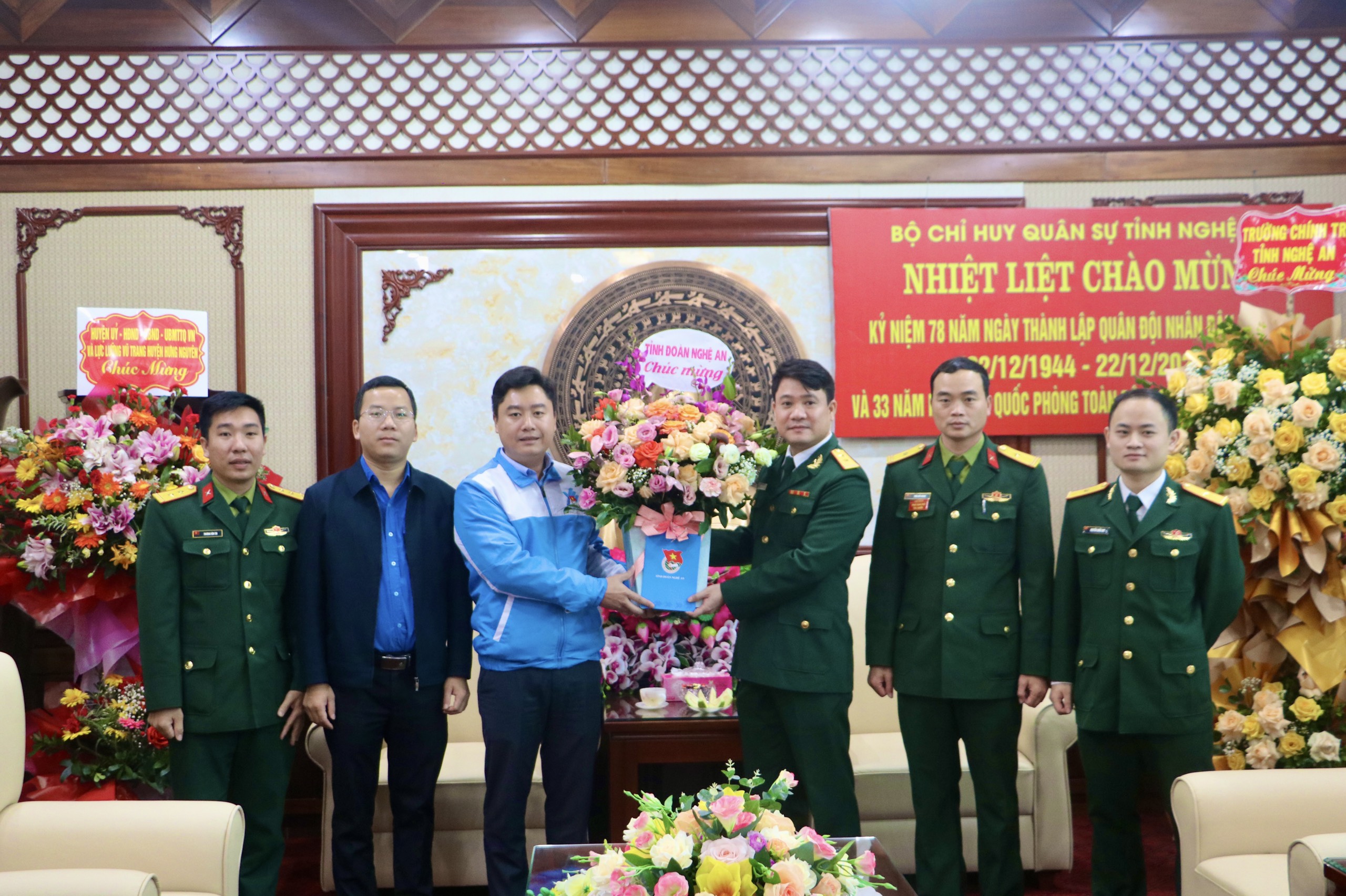 Dịp này, đồng chí Lê Văn Lương - Ủy viên Thường vụ Trung ương Đoàn, Bí thư Tỉnh đoàn thay mặt Ban thường vụ Tỉnh đoàn thăm và chúc mừng Bộ chỉ huy Quân sự tỉnh Nghệ An và Cục chính trị Quân khu 4. Thay mặt tuổi trẻ toàn tỉnh, đồng chí Bí thư Tỉnh đoàn đã gửi lời chúc mừng tới toàn lực lượng, tiếp tục phát huy truyền thống vẻ vang của “Bộ đội cụ Hồ”, nêu cao tinh thần đoàn kết, sáng tạo, hoàn thành xuất sắc mọi nhiệm vụ.