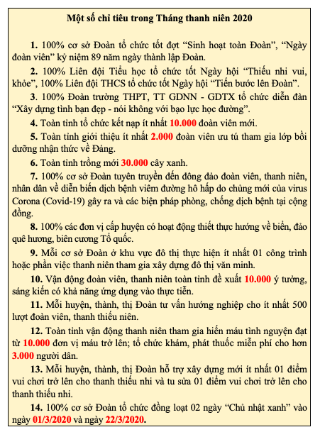 Thực hiện chỉ đạo của Trung ương Đoàn, UBND tỉnh, trước tình hình dịch bệnh COVID-19 đang có diễn biến phức tạp tại Trung Quốc và một số quốc gia, vùng lãnh thổ trên thế giới, năm nay, Ban Thường vụ Tỉnh đoàn đề nghị Ban Thường vụ các huyện, thành, thị Đoàn và Đoàn trực thuộc triển khai một số nội dung trong Tháng Thanh niên năm 2020, trong đó, yêu cầu các cấp bộ Đoàn toàn tỉnh không tổ chức lễ ra quân, lễ khởi động Tháng Thanh niên theo hình thức tập trung đông người. Theo đó, các cấp bộ Đoàn toàn tỉnh vẫn tổ chức các hoạt động thiết thực, ý nghĩa theo các nội dung trọng tâm của Tháng và nhấn mạnh các hoạt động tuyên truyền phòng, chống dịch bệnh COVID-19 với phương châm GỌN NHẸ - TIẾT KIỆM - AN TOÀN - HIỆU QUẢ.