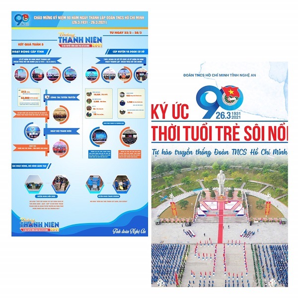Toàn tỉnh đăng tải hơn 32.950 tin bài trên các trang fanpage, website về tuyên truyền các hoạt động Tháng Thanh niên và phòng, chống dịch bệnh Covid-19, facebook Tỉnh đoàn Nghệ An thường xuyên đăng tải tin bài với lượt tương tác trung bình hơn 151.200 lượt/tháng, gần 350.000 số người được tiếp cận bài viết/tháng. Các cấp bộ Đoàn phối hợp với các cơ quan thông tấn báo chí xây dựng tuyến tin bài hình ảnh, video về Tháng Thanh niên tuyên truyền trên các phương tiện truyền thông, tích cực tuyền truyền trực quan với hàng nghìn băng rôn, khẩu hiệu, phướn, pano, tờ rơi; thiết kế và đặt hơn 515 hình chibi thanh niên gắn khẩu hiệu tuyên truyền 90 năm Ngày thành lập Đoàn TNCS Hồ Chí M; phát động cuộc thi MV “Tự hào là cán bộ Đoàn” trong toàn Đoàn, ban Tổ chức đã nhận được 35 MV dự thi được đầu tư công phu.