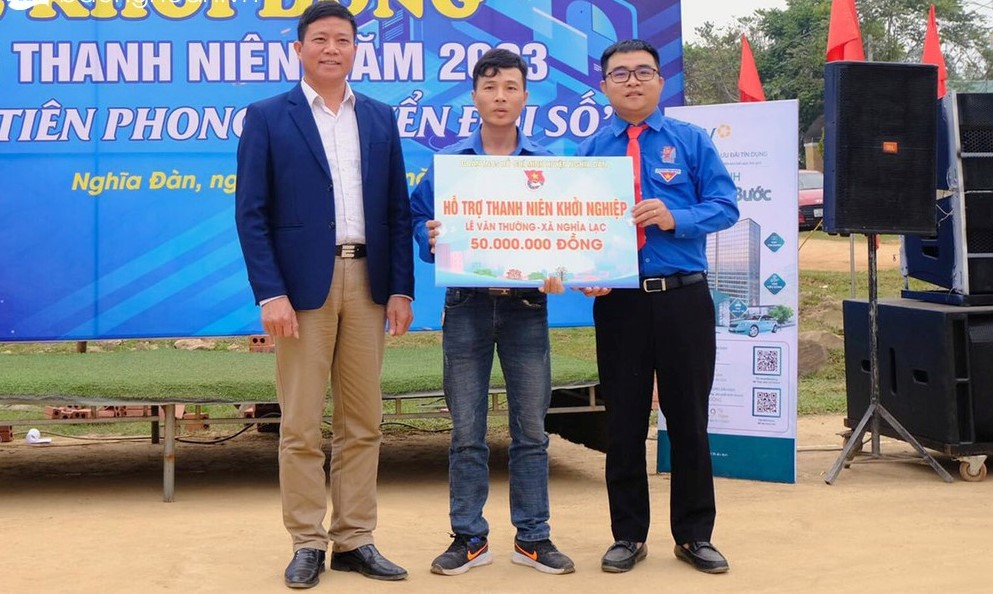 Hỗ trợ 50 triệu đồng từ quỹ Thanh niên khởi nghiệp huyện Nghĩa Đàn cho thanh niên phát triển kinh tế tại xã Nghĩa Lạc. Ảnh: CSCC