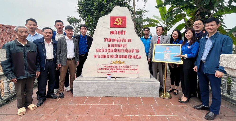 Tuổi trẻ Đoàn Khối Các cơ quan tỉnh gắn mã QR tại Bia dẫn tích lưu dấu về thời gian làm việc của Cơ quan Đảng ủy Khối các cơ quan tỉnh tại xã Quang Sơn (huyện Đô Lương). Ảnh: CSCC