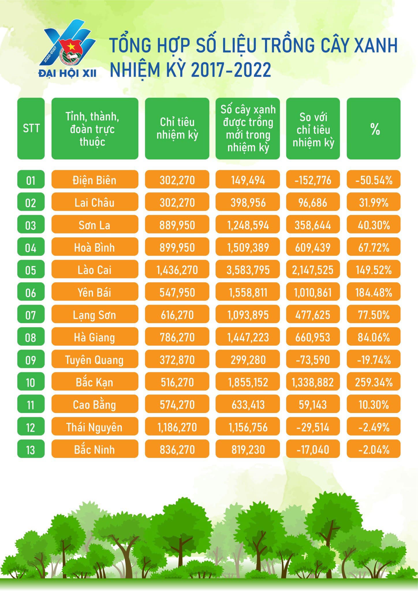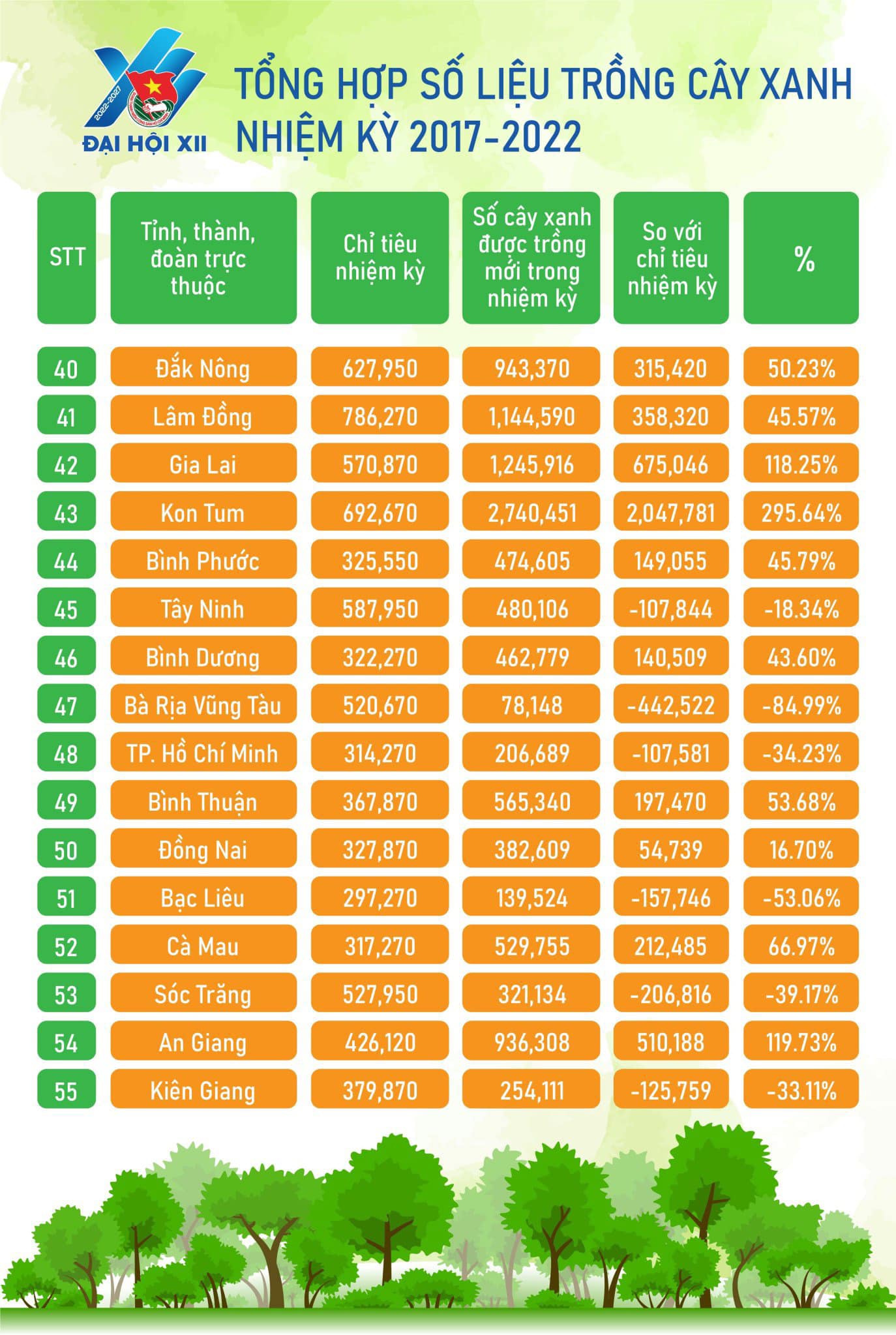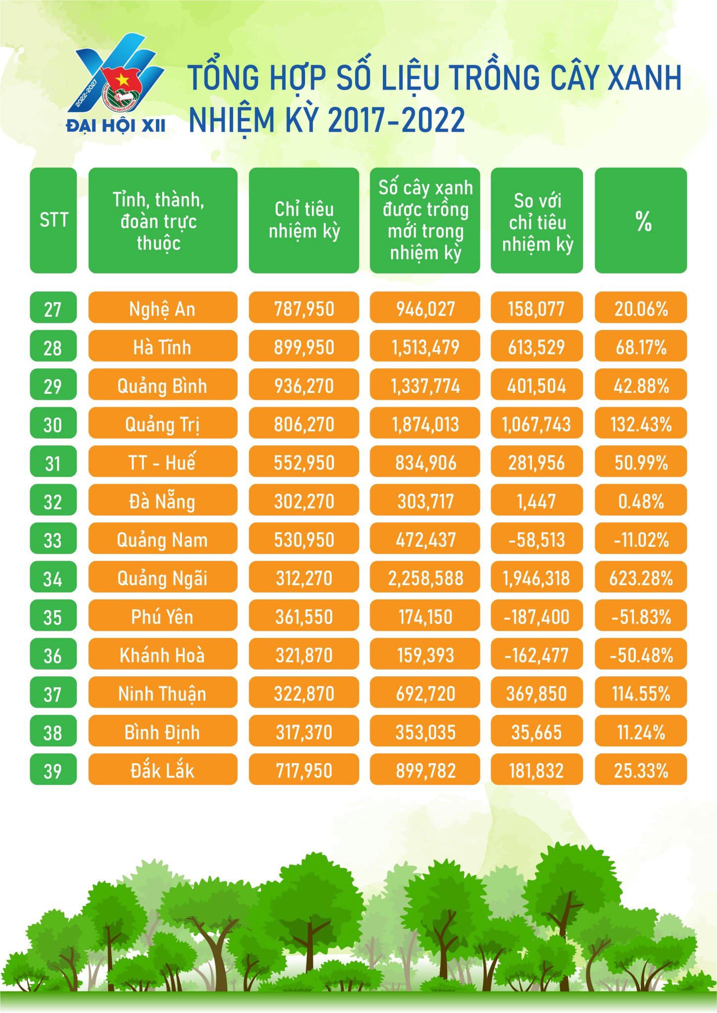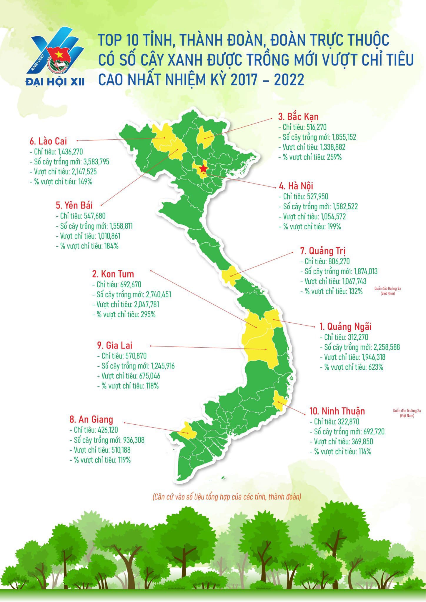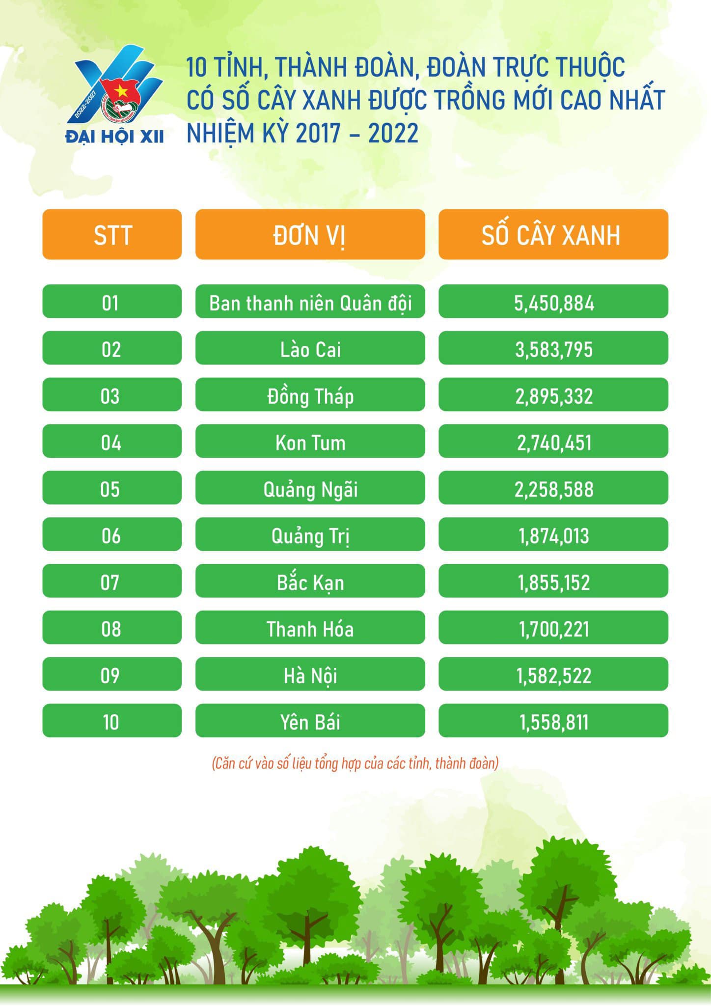 Trong đó, đặc biệt tỉnh Đoàn Quảng Ngãi có số cây xanh vượt chỉ tiêu cao nhất, trồng mới 2.258.588 cây xanh (Vượt chỉ tiêu 623%), theo Kế hoạch 400a-KH/TWĐTN-TNNT ngày 16/7/2021; Ban Thanh niên Quân Đội có số cây xanh trồng mới cao nhất nhiệm kỳ: 5.450.884 cây xanh.