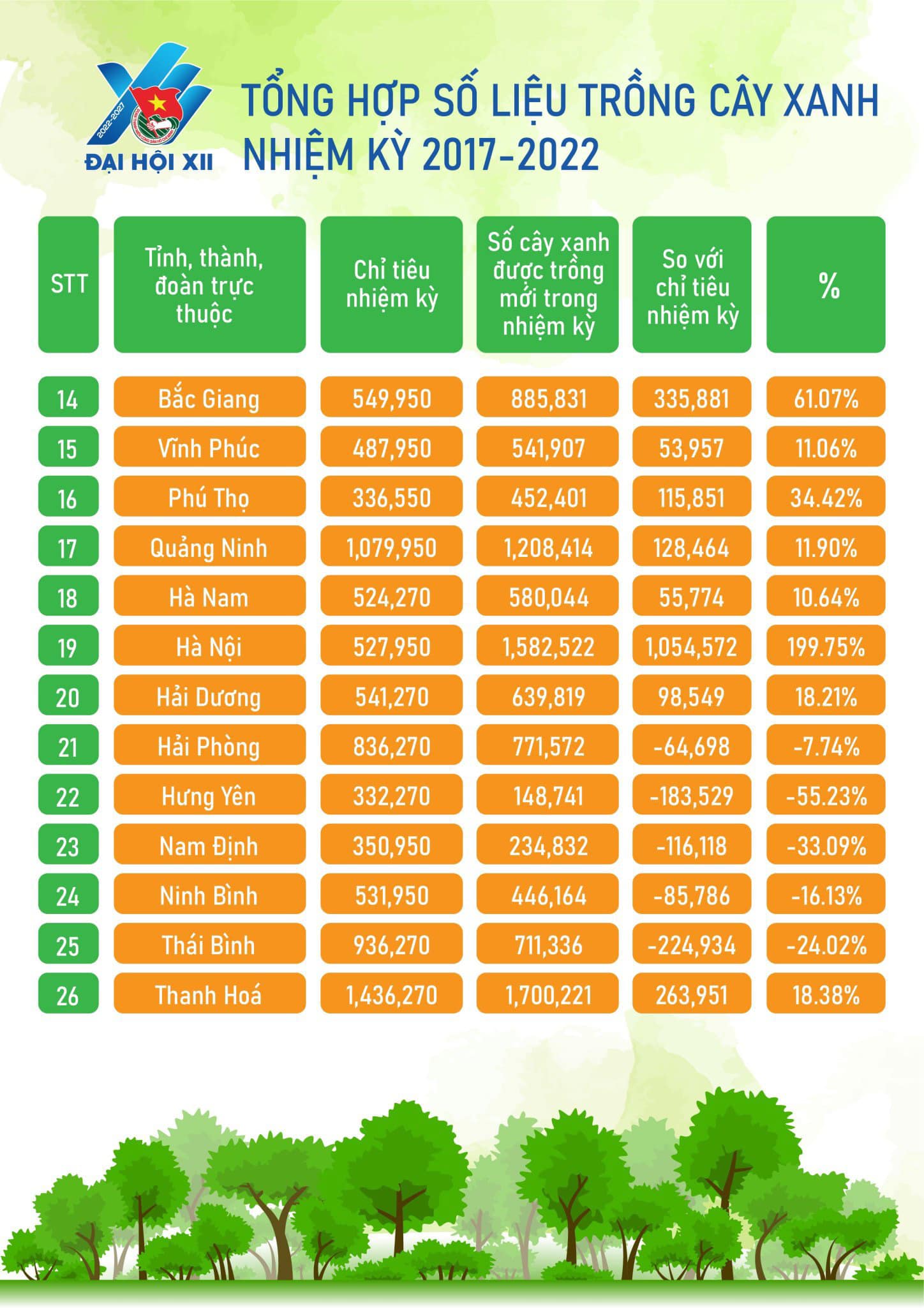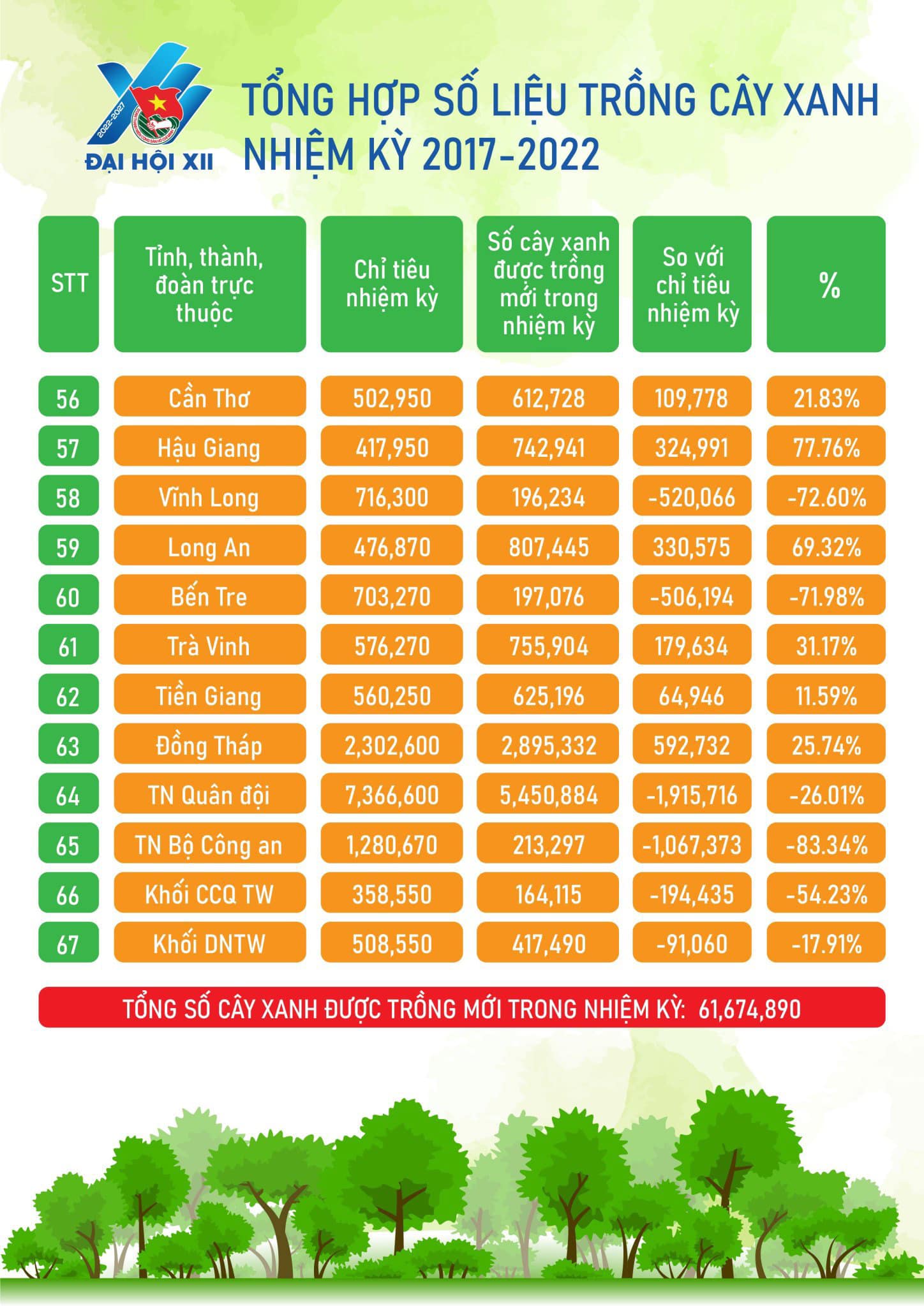 So với chỉ tiêu đặt ra trong nhiệm kỳ, số lượng cây xanh được trồng tăng gấp đôi với 61 triệu cây xanh được trồng mới.