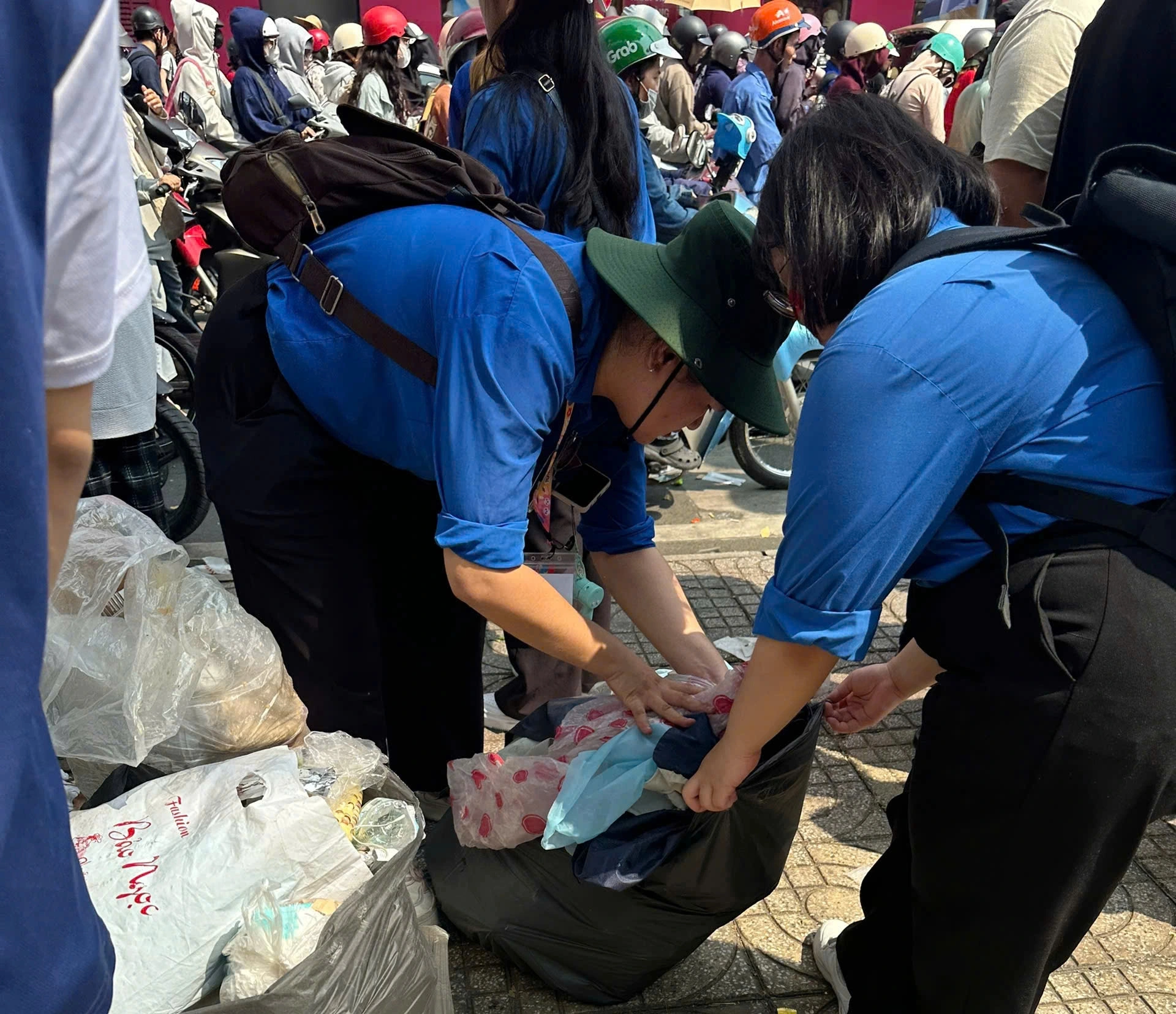 Nhiều nhóm thanh niên chia làm nhiều tổ, thu dọn trên nhiều khu vực. Các vật dụng sau khi được thu gom sẽ được phân loại và tập kết lại chờ xử lý.