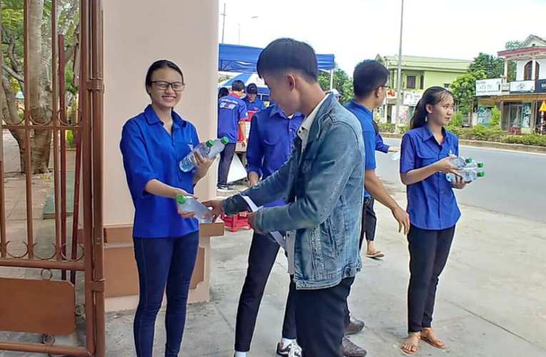 Đoàn viên, thanh niên tình nguyện phát nước cho các thí sinh tham dự kỳ thi THPT Quốc gia năm 2019