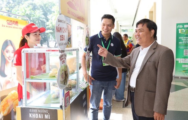 Bánh khoai mì Cusami của anh Mai Tuấn Anh (áo xanh) đạt giải nhất bảng A cuộc thi Khởi nghiệp Xanh 2024