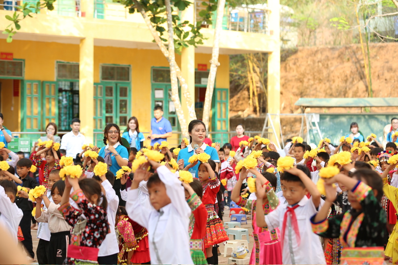 Cô Thuý cho biết, địa bàn xã còn nhiều hộ nghèo, bà con chủ yếu làm nương rẫy, nhiều gia đình đông con nên không có điều kiện cho con ăn học đầy đủ. Bản thân cô Thuý và các thầy cô trong trường phải thường xuyên đến từng gia đình tuyên truyền, vận động phụ huynh cho con đến trường. Hiện trường có 649 học sinh chia làm 6 điểm bản. Điểm xa nhất cách trung tâm 20 km, chưa có điện, đường đi còn khó khăn. Ở điểm trường chính có 14 lớp hơn 400 học sinh ăn ở bán trú. Các em chưa khi nào được uống sữa tươi. Vì thế, khi nghe tin trường được đoàn đại biểu Hội SVVN đến tặng quà, tặng sữa và nấu ăn cho học sinh, cả thầy cô và học trò đều háo hức.