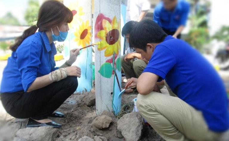 Đoàn viên thanh niên vẽ trang trí cột điện trên các tuyến đường