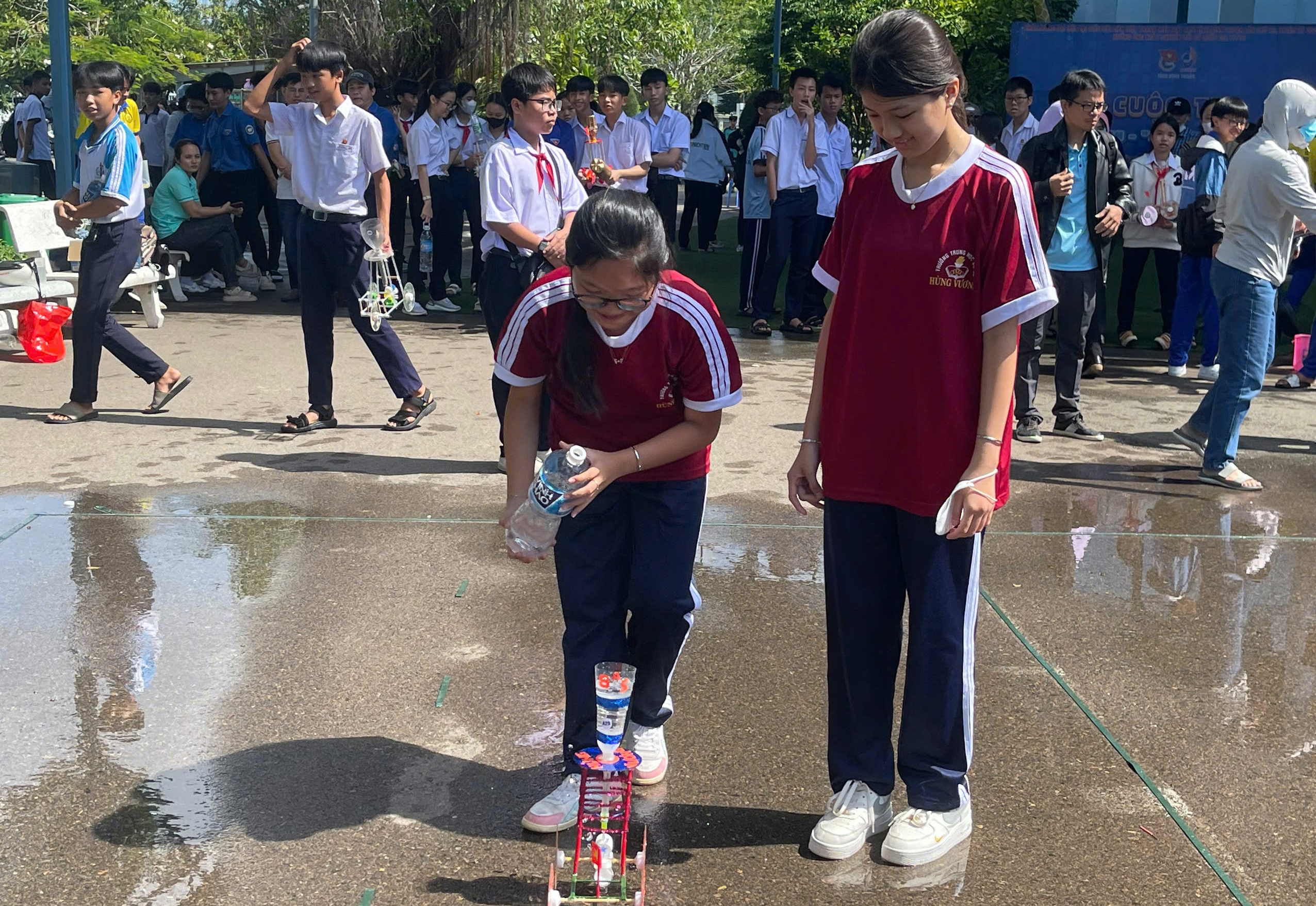 Các bạn học sinh đang tham gia phần thi thuỷ lực
