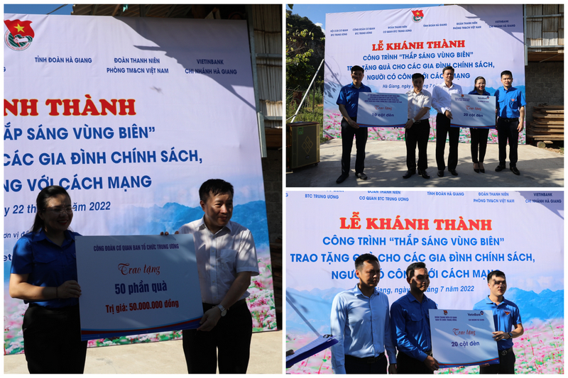 Tại chương trình, đoàn công tác đã khánh thành công trình thanh niên “Thắp sáng vùng biên” và trao tặng quà cho gia đình chính sách, người có công với cách mạng tại thôn Nặm Ngặt, xã Thanh Thủy, huyện Vị Xuyên, tỉnh Hà Giang.
