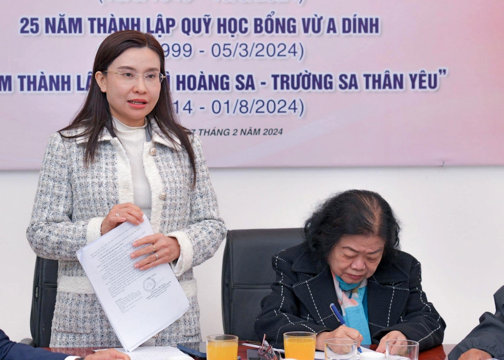 Đồng chí Trương Mỹ Hoa - nguyên Phó Chủ tịch nước, Chủ tịch Quỹ học bổng Vừ A Dính, Chủ nhiệm CLB "Vì Hoàng Sa - Trường Sa thân yêu" phát biểu tại buổi họp mặt