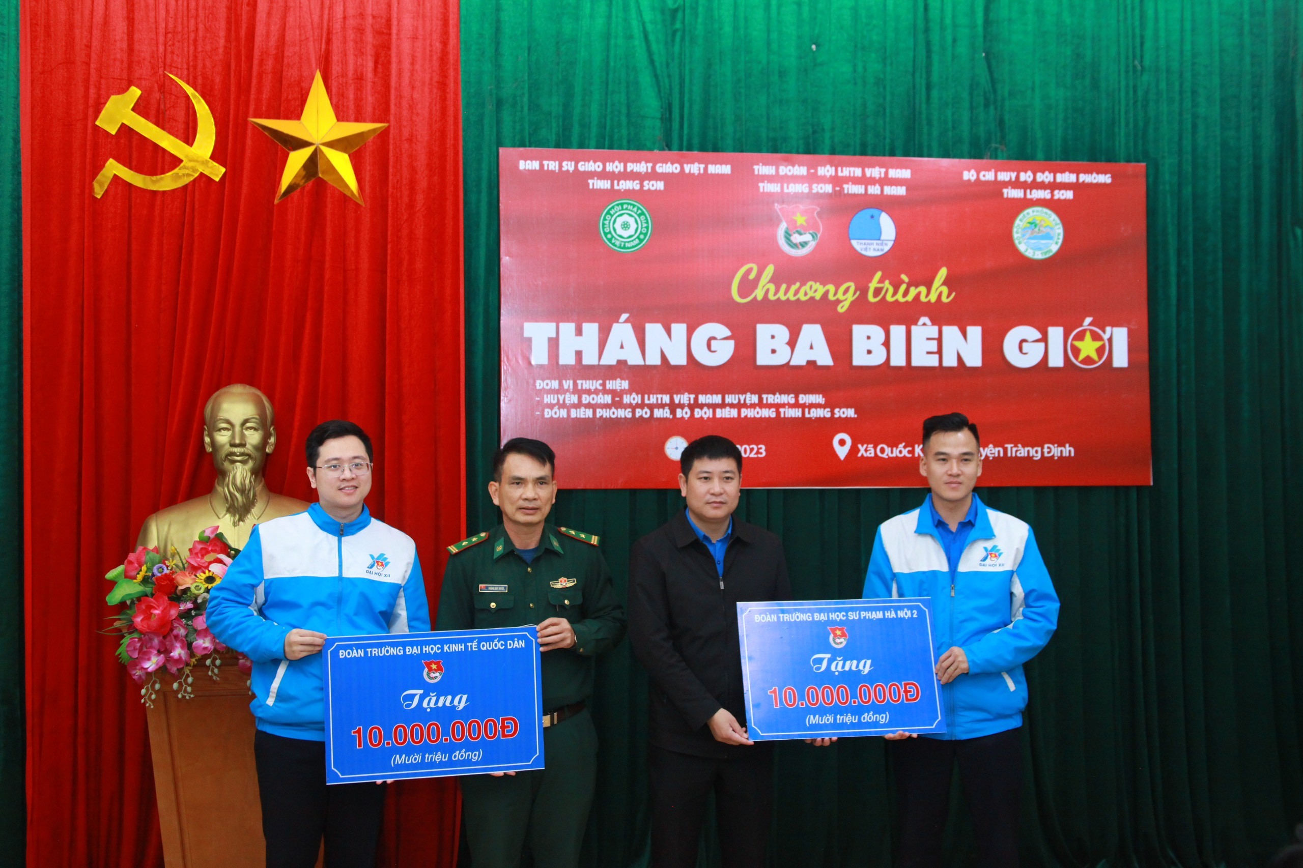 Tại chương trình, Tỉnh đoàn Hà Nam trao tặng kinh phí 30 triệu đồng hỗ trợ xây dựng tuyến đường kiểm tra cột mốc Quốc giới số 975 và 975/1 cho Đồn Biên phòng Pò Mã; Ban Trị sự Giáo hội Phật giáo Việt Nam tỉnh Lạng Sơn, Tỉnh đoàn - Hội LHTN Việt Nam tỉnh Lạng Sơn trao tặng kinh phí 100 triệu đồng hỗ trợ xây dựng đường tuyến đường kiểm tra cột mốc quốc giới tại huyện Tràng Định; đại diện Trường Đại học Sư phạm Hà Nội 2 và Trường Đại học Kinh tế Quốc dân Hà Nội trao tặng hỗ trợ kinh phí thực hiện công trình “Thắp sáng đường thôn” trị giá 20 triệu đồng cho Huyện Tràng Định.