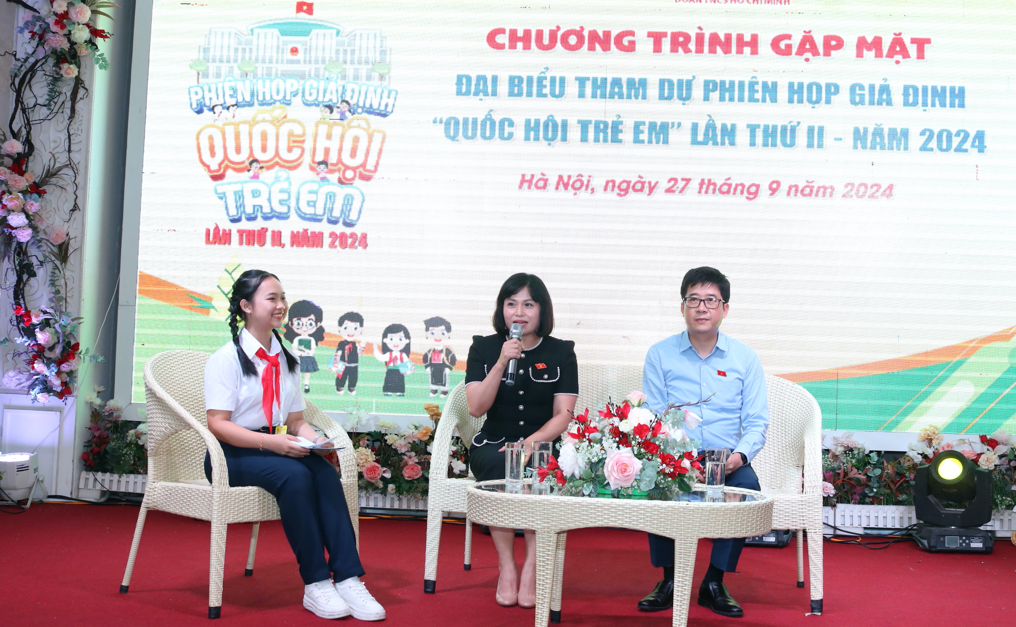 Phát biểu tại chương trình, đồng chí Thái Quỳnh Mai Dung cho biết, 306 đại biểu trẻ em tham gia phiên họp giả định Quốc hội trẻ em lần thứ II, năm 2024 đến từ mọi miền Tổ quốc, có nhiều bạn đạt thành tích cao trong học tập, rèn luyện, thể dục thể thao, văn hoá văn nghệ. Trong đó, có những em hoàn cảnh khó khăn, dân tộc thiểu số nhưng tất cả các em đều mang theo hành trang không chỉ là phong thái chững chạc, tự tin, mạnh dạn mà còn là sự gửi gắm những ý kiến, nguyện vọng, tình cảm của hơn 25 triệu đội viên, thiếu niên và nhi đồng cả nước gửi đến các bác, các cô chú lãnh đạo. “Những ý kiến xác đáng của các em sẽ là cơ sở để Quốc hội, Chính phủ, các ban, Bộ, ngành, chính quyền các địa phương cùng quan tâm để giải quyết. Các em chính là niềm tự hào của gia đình, thầy cô, bạn bè và của tổ chức Đội TNTP Hồ Chí Minh”, đồng chí Thái Quỳnh Mai Dung nói.