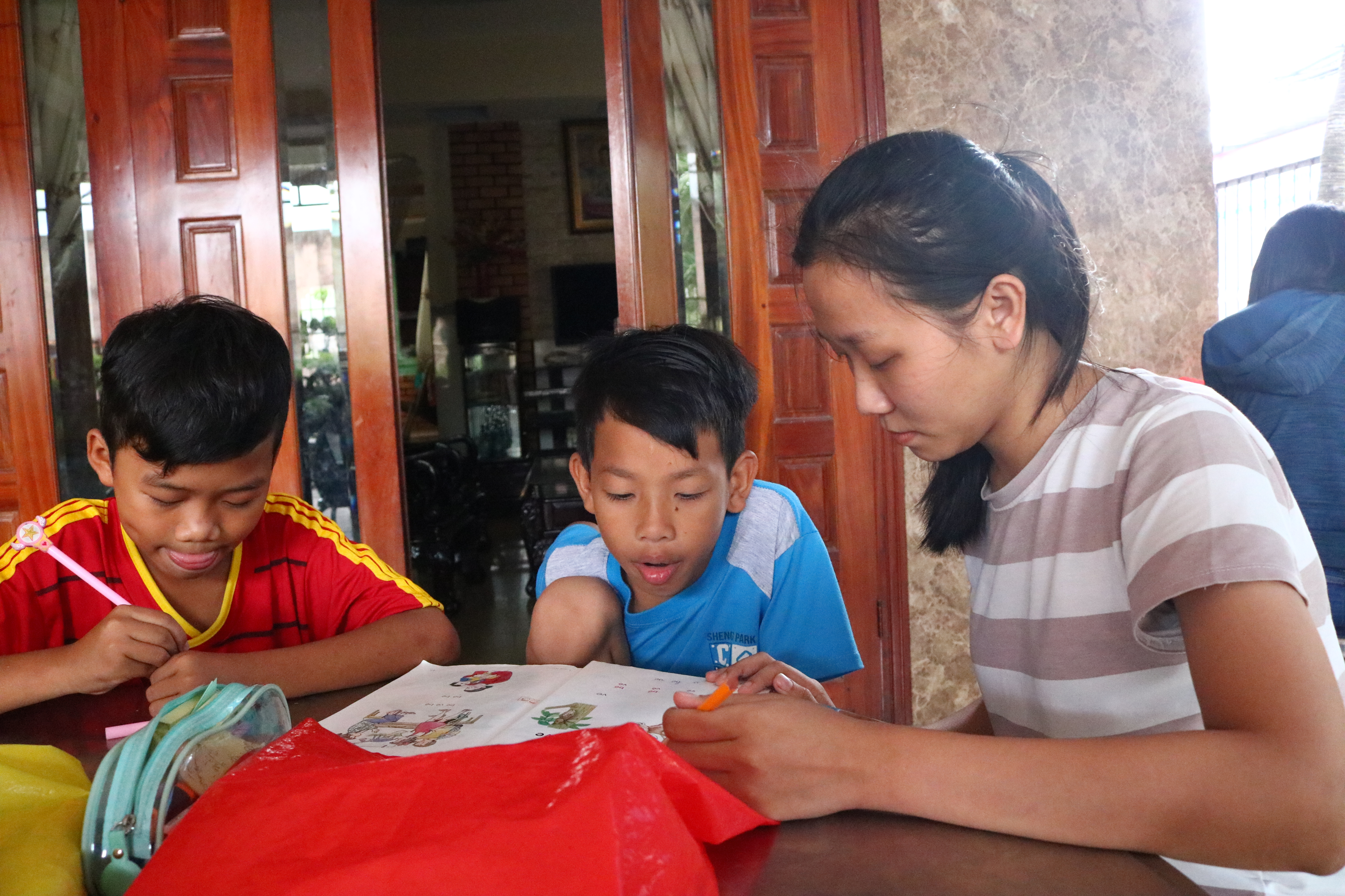 “Có mấy em học sinh lớp 1, lớp 2 vẫn không nhận diện được âm, không nghe viết chính tả được. Mình phải rất kiên nhẫn dạy lại cách phát âm, đánh vần cho các em”, Trâm Em nói thêm.