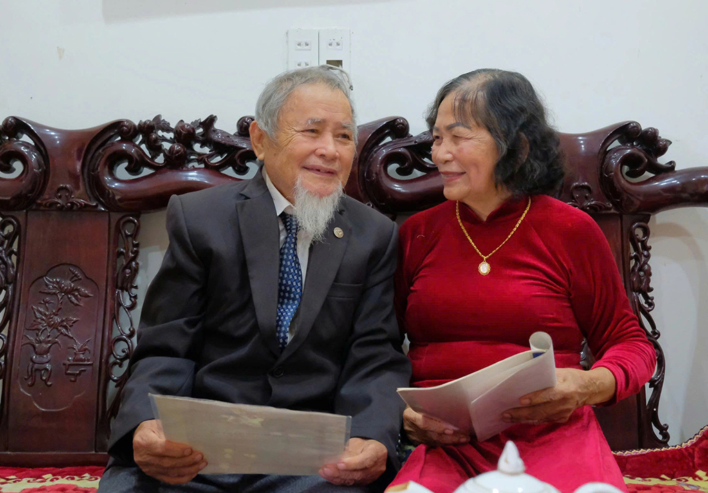Ông Thỉ và vợ ôn lại kỷ niệmvề Hợp tác xã Măng non Duy Viên. ẢNH: THANH LỘC