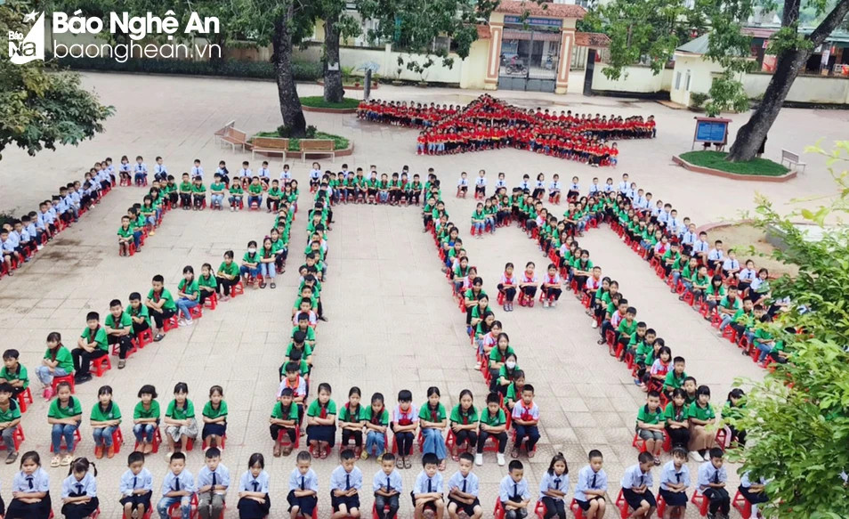 Tiết mục xếp chữ đầy ấn tượng của các em học sinh Trường Tiểu học Tô Bá Ngọc (xã Minh Thành, huyện Yên Thành) chào mừng ngày 20/11. Ảnh: Nhân vật cung cấp