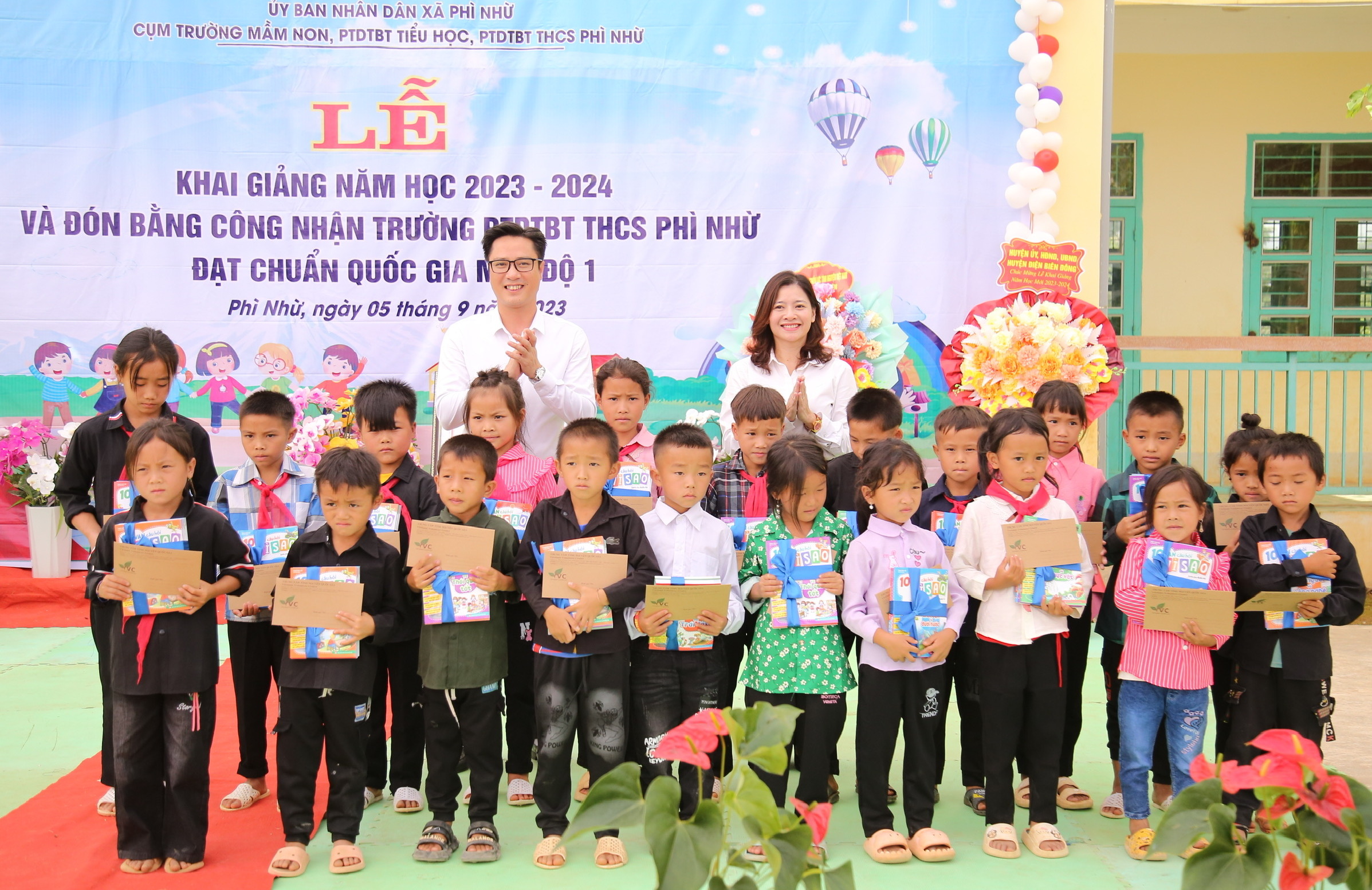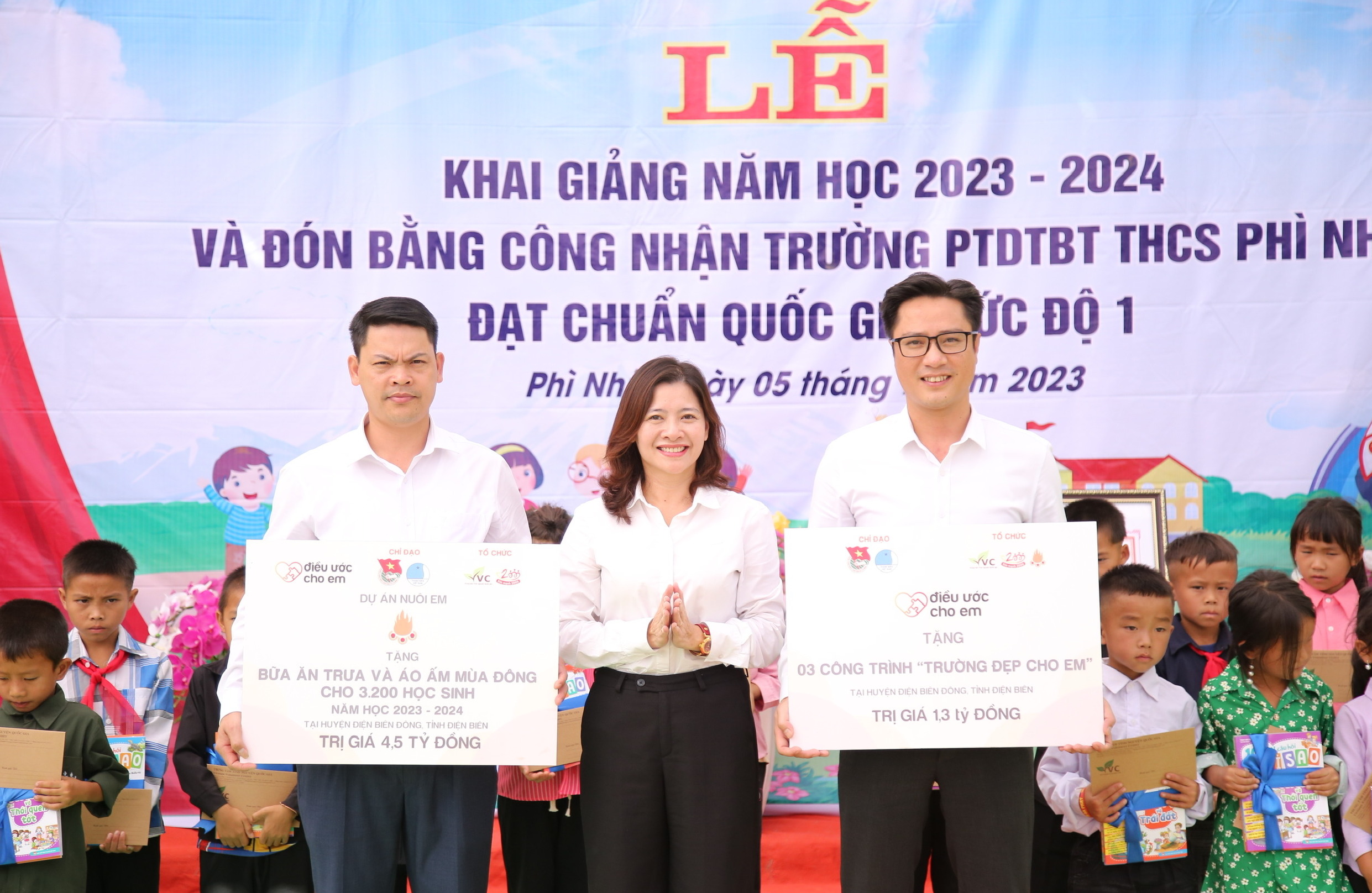 Nhân dịp Lễ khai giảng, đoàn công tác đã trao tặng 20 suất học bổng cho 20 em học sinh dân tộc thiểu số có hoàn cảnh khó khăn, trao biển chương trình “Nuôi em” hỗ trợ bữa ăn trưa trong năm học mới 2023-2024 và áo ấm cho 3.200 em học sinh dân tộc thiểu số tại các điểm trường khó khăn của huyện Điện Biên Đông trị giá 4,5 tỷ đồng, trao biển hỗ trợ 03 công trình “Trường đẹp cho em” cho các điểm trường trị giá 1,3 tỷ đồng, trao tặng 02 “Cây cầu hạnh phúc” trị giá 700 triệu đồng.