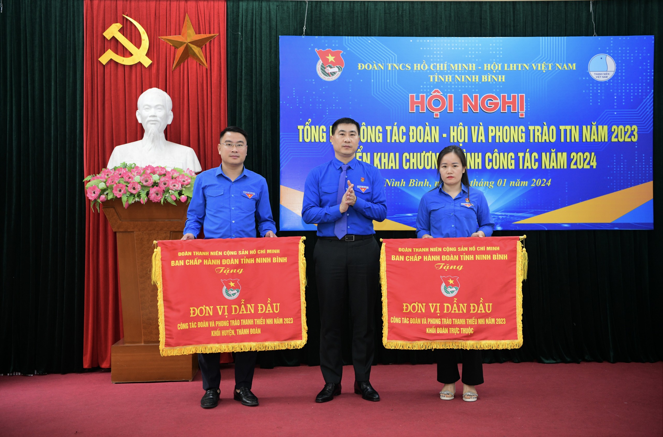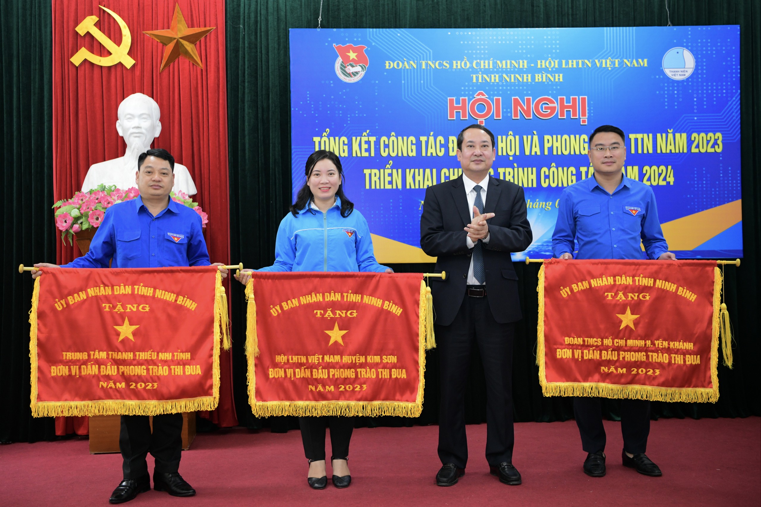 Cũng nhân dịp này, đồng chí Mai Văn, Phó Bí thư Thường trực Tỉnh ủy, Chủ tịch Hội đồng nhân dân tỉnh đã tặng Cờ đơn vị dẫn đầu phong trào thi đua cho Đoàn TNCS Hồ Chí Minh huyện Yên Khánh, Hội LHTN Việt Nam huyện Kim Sơn và Trung tâm Thanh thiếu nhi tỉnh; đại diện Thường trực Tỉnh đoàn, tỉnh Hội trao tặng cờ thi đua và bằng khen của Trung ương Đoàn, Trung ương Hội, Tỉnh đoàn, tỉnh Hội cho 205 tập thể, cá nhân có thành tích xuất sắc trong công tác Đoàn, Hội và phong trào thanh thiếu nhi năm 2023.