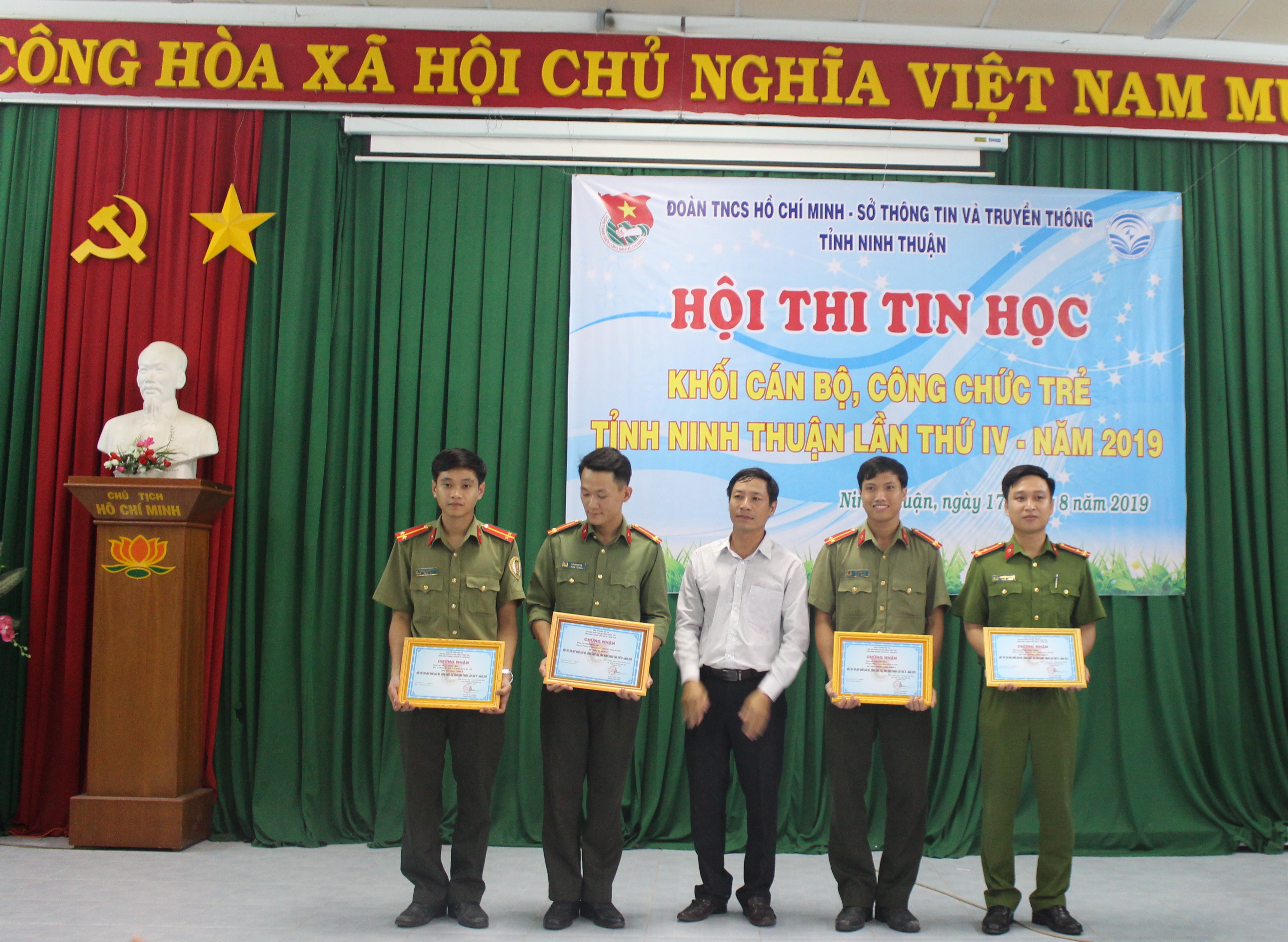 Kết quả, Ban Tổ chức đã trao 24 giải (Nhất, Nhì, Ba và Khuyến khích) cho các tập thể, cá nhân đạt kết quả cao tại Hội thi. Giải nhất (Bảng A) được trao cho thí sinh Phan Thị Thu Thùy - Trường THPT Ischool Ninh Thuận, Giải Nhất (Bảng W) trao cho thí sinh Thuỷ Hữu Trường Lưu – Phòng An ninh kinh tế, Công an tỉnh, Giải Nhất (Bảng E) trao cho thí sinh Nguyễn Văn Tuyên - Đại đội Thiết giáp, Bộ Chỉ huy Quân sự tỉnh; Giải nhất (Bảng P) trao cho thí sinh Võ Lê Thanh Lâm - Phòng An ninh đối ngoại, Công an tỉnh. Ban Tổ chức Hội thi trao 01 Giải tập thể có đông thí sinh tham gia và đạt nhiều giải nhất cho Đoàn TN Công an tỉnh.