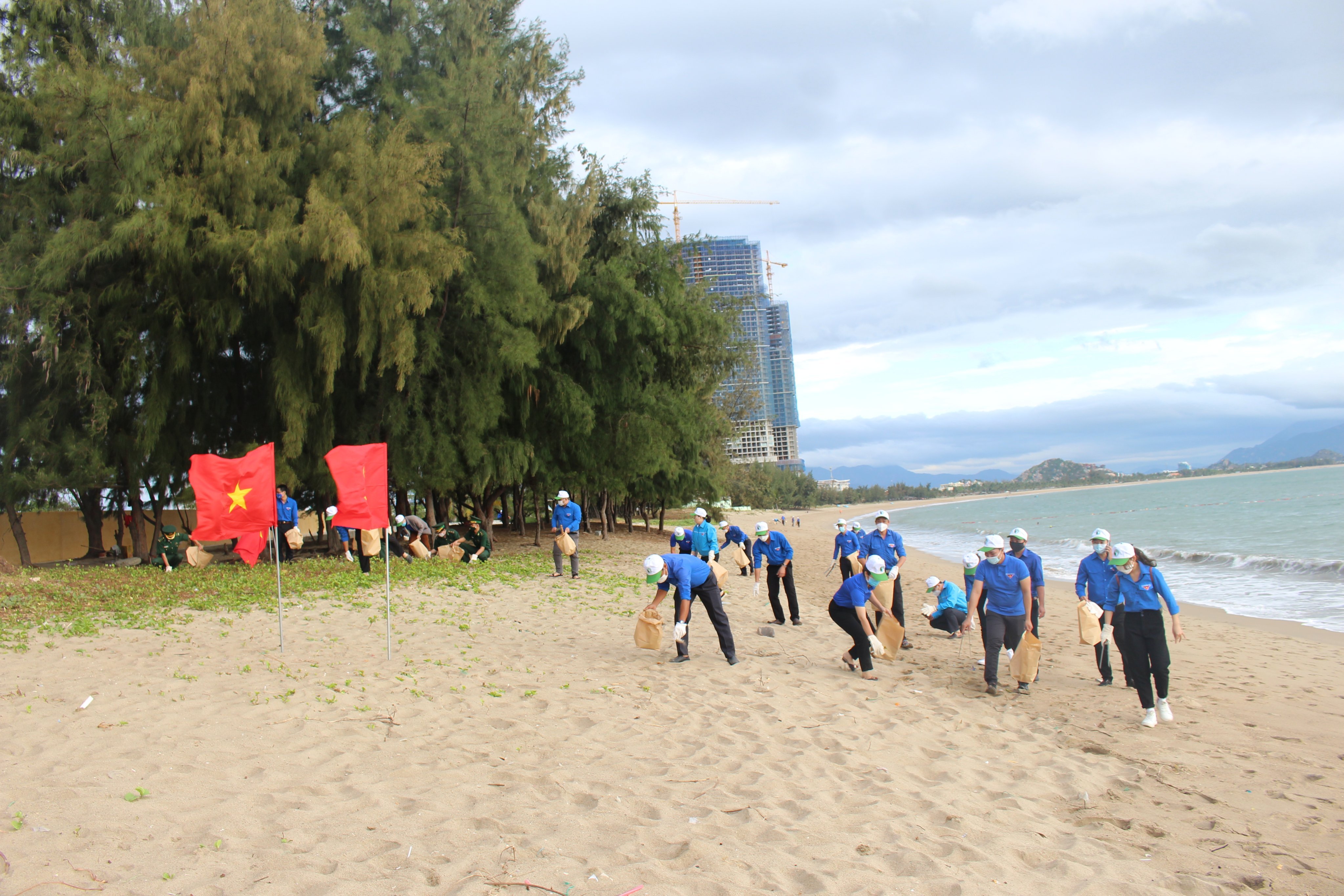 Đoàn viên thanh niên tham gia vệ sinh môi trường tại khu vực bãi biển Bình Sơn - Ninh Chữ