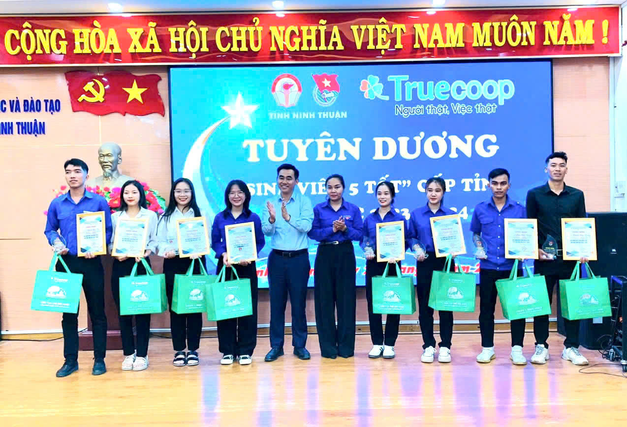 Nhân dịp này, Ban Thường vụ Tỉnh Đoàn phối hợp với Sở Giáo dục và Đào tạo tuyên dương 12 giáo viên, giảng viên trẻ tiêu biểu; công nhận Danh hiệu “Học sinh 3 tốt” cho 33 cá nhân, danh hiệu “Học sinh 3 rèn luyện” cho 01 học sinh và danh hiệu “Sinh viên 5 tốt ” cho 09 sinh viên; tặng Bằng khen của Ban Chấp hành Tỉnh Đoàn cho 15 cá nhân và 03 tập thể có thành tích xuất sắc trong Công tác Đoàn – Đội trường học, năm học 2023 – 2024; tặng Bằng khen của Ban Thường vụ Tỉnh Đoàn về thành tích xuất sắc trong công tác Đoàn và Phong trào Thanh niên trường học cấp huyện năm học 2023 - 2024 cho Đoàn Phân hiệu trường ĐH Nông lâm TPHCM tại Ninh Thuận.
