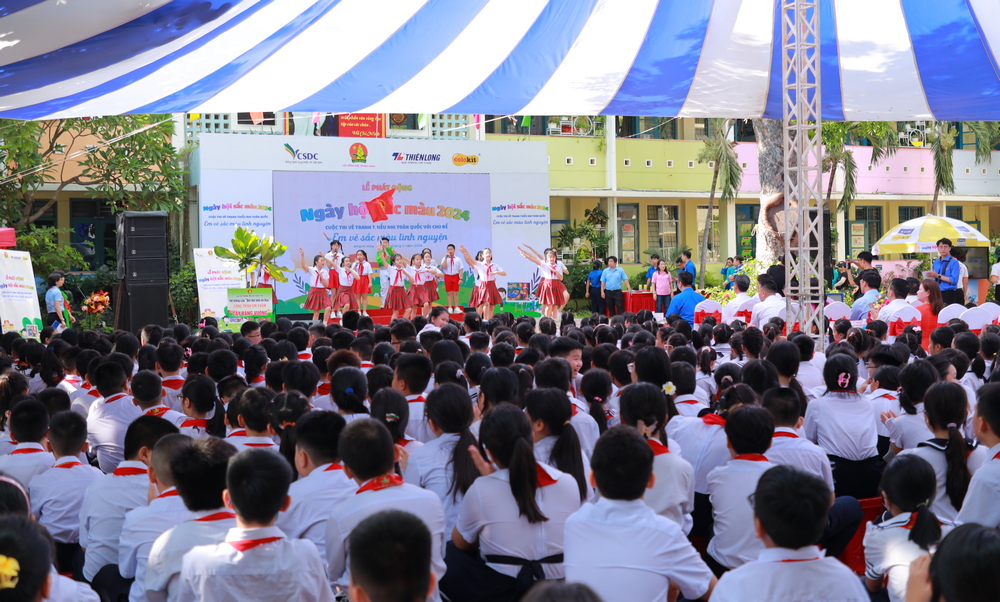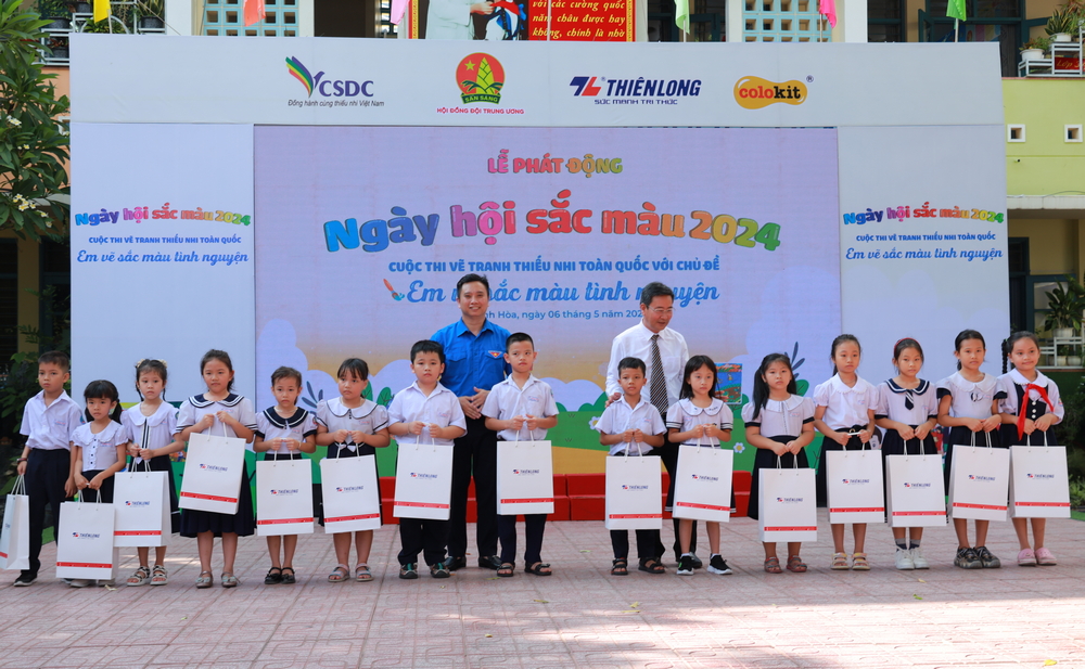 ĐTN: Sáng ngày 6/5, tại trường Tiểu học Phước Tiến, TP Nha Trang, tỉnh Khánh Hòa, Hội đồng Đội T.Ư phối hợp với Công ty Cổ phần Tập đoàn Thiên Long - Nhãn hàng dụng cụ Mỹ thuật Colokit tổ chức phát động “Ngày hội sắc màu” năm 2024 - Cuộc thi vẽ tranh với chủ đề “Em vẽ sắc màu tình nguyện” trong đội viên, thiếu niên và nhi đồng cả nước.
