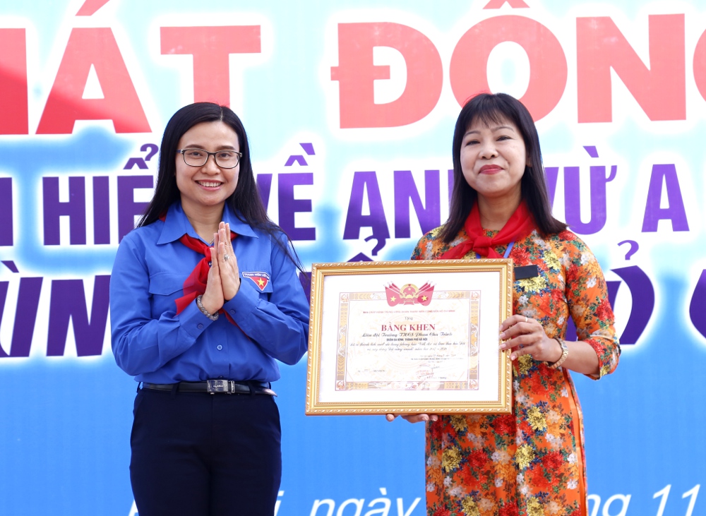 Phó Chủ tịch Thường trực Hội Đồng Đội Trung ương Nguyễn Phạm Duy Trang trao Bằng khen của Trung ương Đoàn cho Liên đội trường THCS Phan Chu Trinh vì có thành tích trong phong trào mua, đọc và làm theo báo Đội, năm học 2017 - 2018