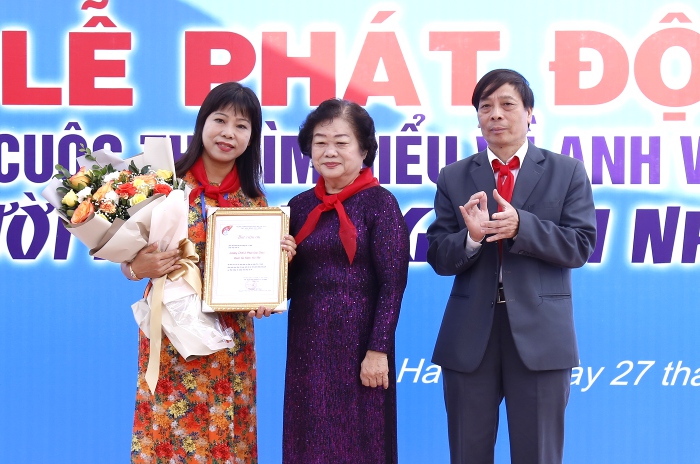 Chủ tịch Quỹ Học bổng Vừ A Dính Trương Mỹ Hoa và Tổng Biên tập Báo TNTP Nguyễn Đức Quang trao Chứng nhận của Ban tổ chức cuộc thi và hoa cho Ban giám hiệu trường THCS Phan Chu Trinh, Hà Nội