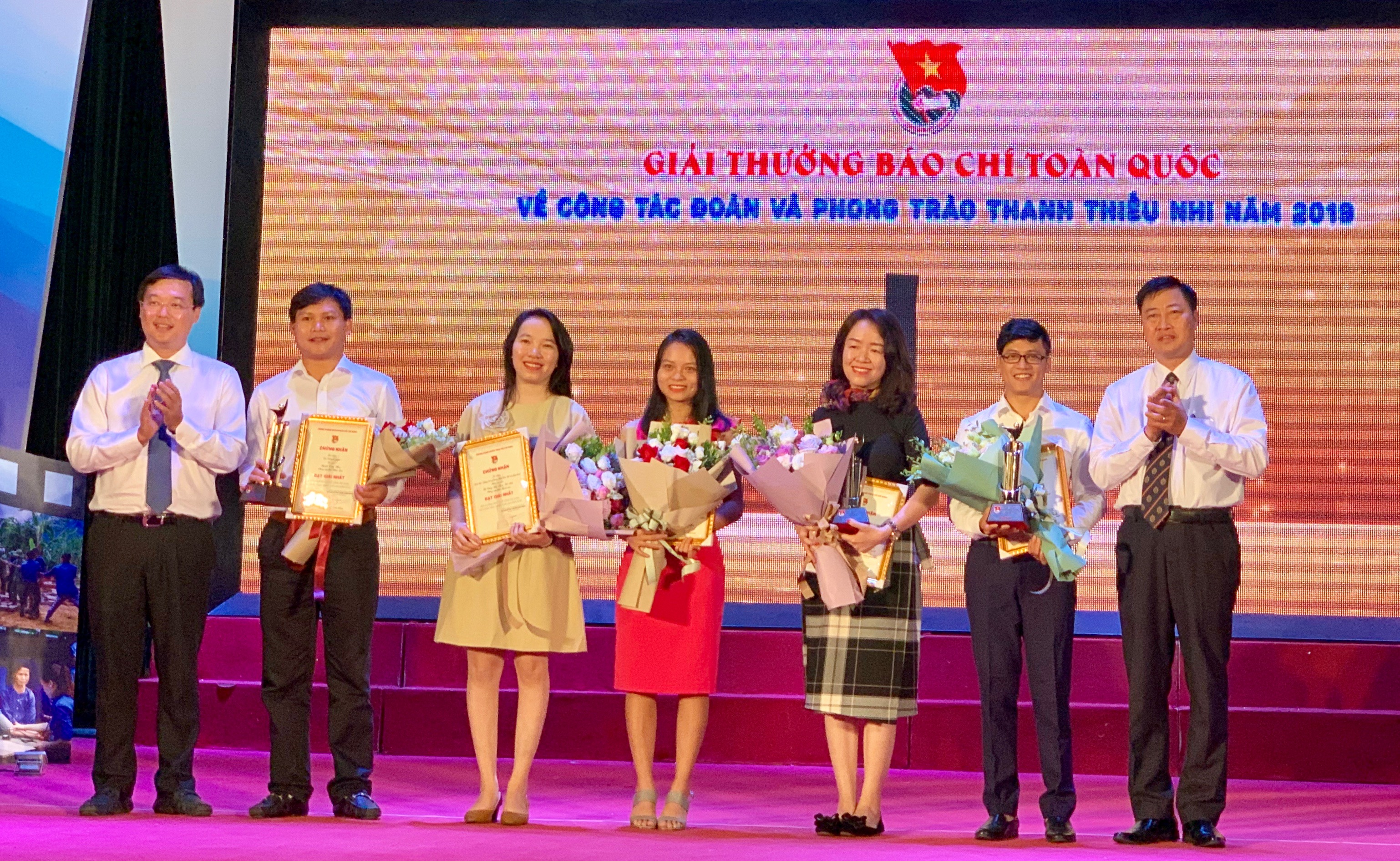 Đồng chí Bùi Tuấn Quang - Phó Trưởng Ban Dân vận Trung ương và Bí thư thứ nhất Trung ương Đoàn Lê Quốc Phong trao giải Nhất cho các tác giả xuất sắc năm 2019