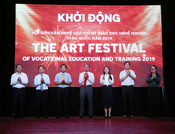 Các đại biểu ấn nút Khởi động Hội diễn văn nghệ các cơ sở giáo dục nghề nghiệp toàn quốc năm 2019