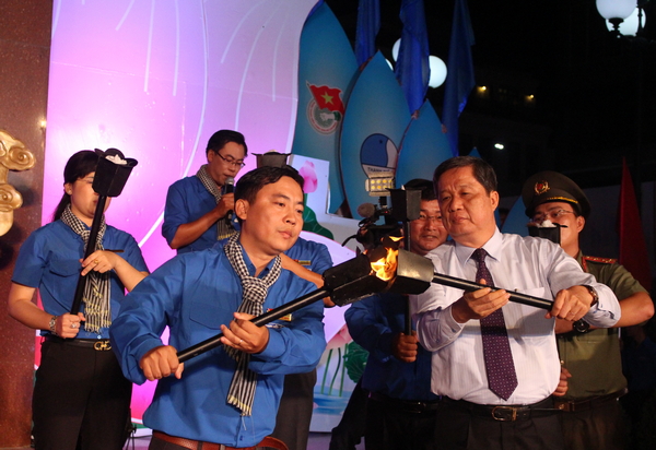 Đồng chí Phạm Văn Hiểu - Phó Bí thư Thường trực Thành ủy Cần Thơ, Chủ tịch HĐND thành phố trao ngọn lửa truyền thống cho tuổi trẻ Cần Thơ