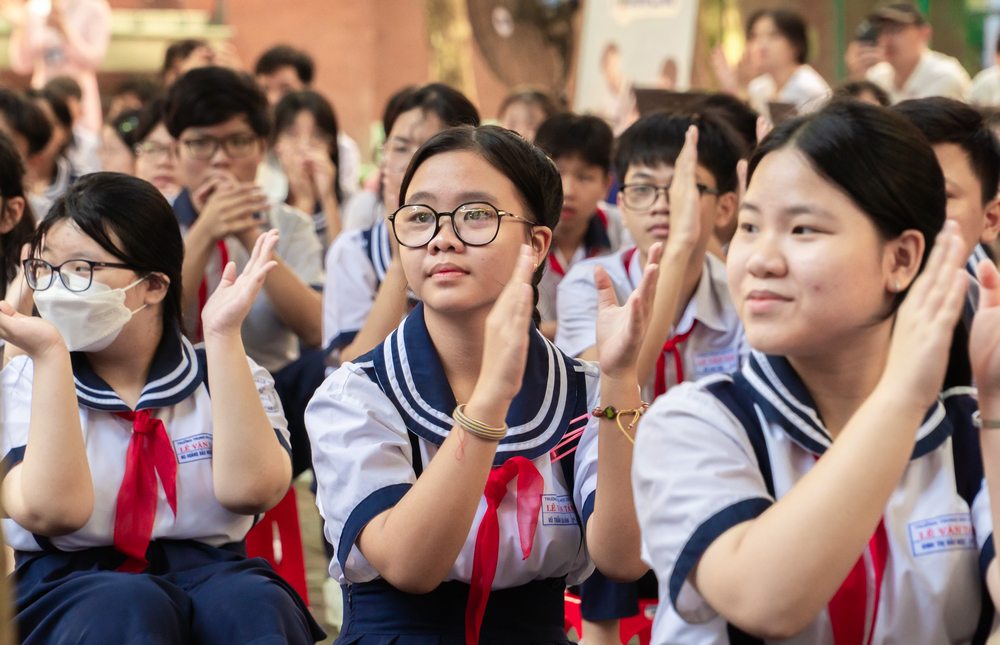 Học sinh tại Trường THCS Lê Văn Tám, Q.Bình Thạnh (TP.HCM) tham dự lễ khởi động sân chơi "Thiếu niên Việt Nam - Công dân toàn cầu" năm 2023