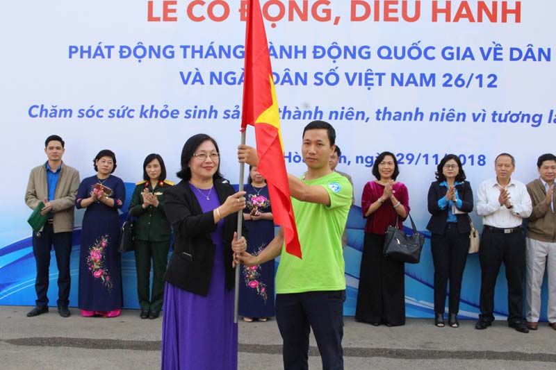 Trao cờ phát động Lễ diễu hành hưởng ứng Tháng hành động quốc gia về Dân số và Ngày Dân số Việt Nam cho đại diện đơn vị diễu hành.