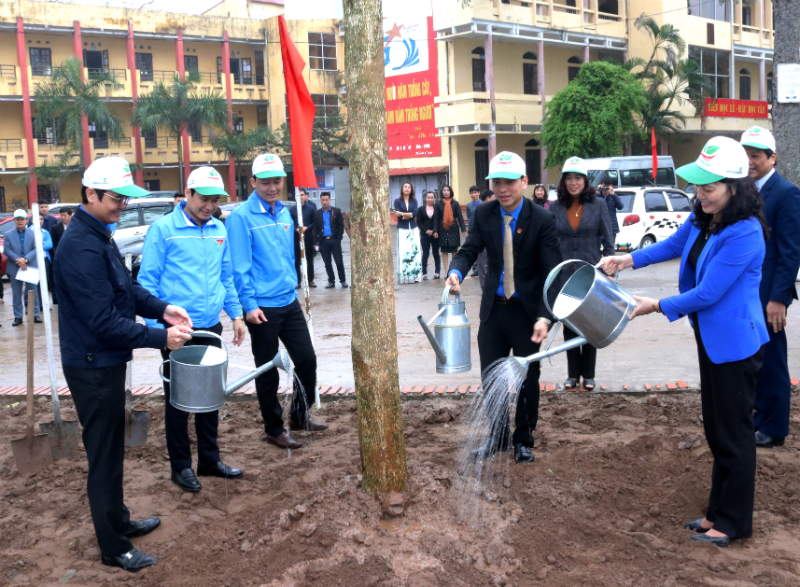 Các đại biểu trồng cây xanh tại trường THPT Tiên Lữ
