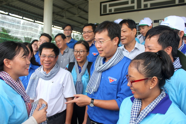 Đồng chí Lê Quốc Phong - Bí thư thứ nhất TƯ Đoàn trò chuyện thăm hỏi các bạn thanh niên tình nguyện