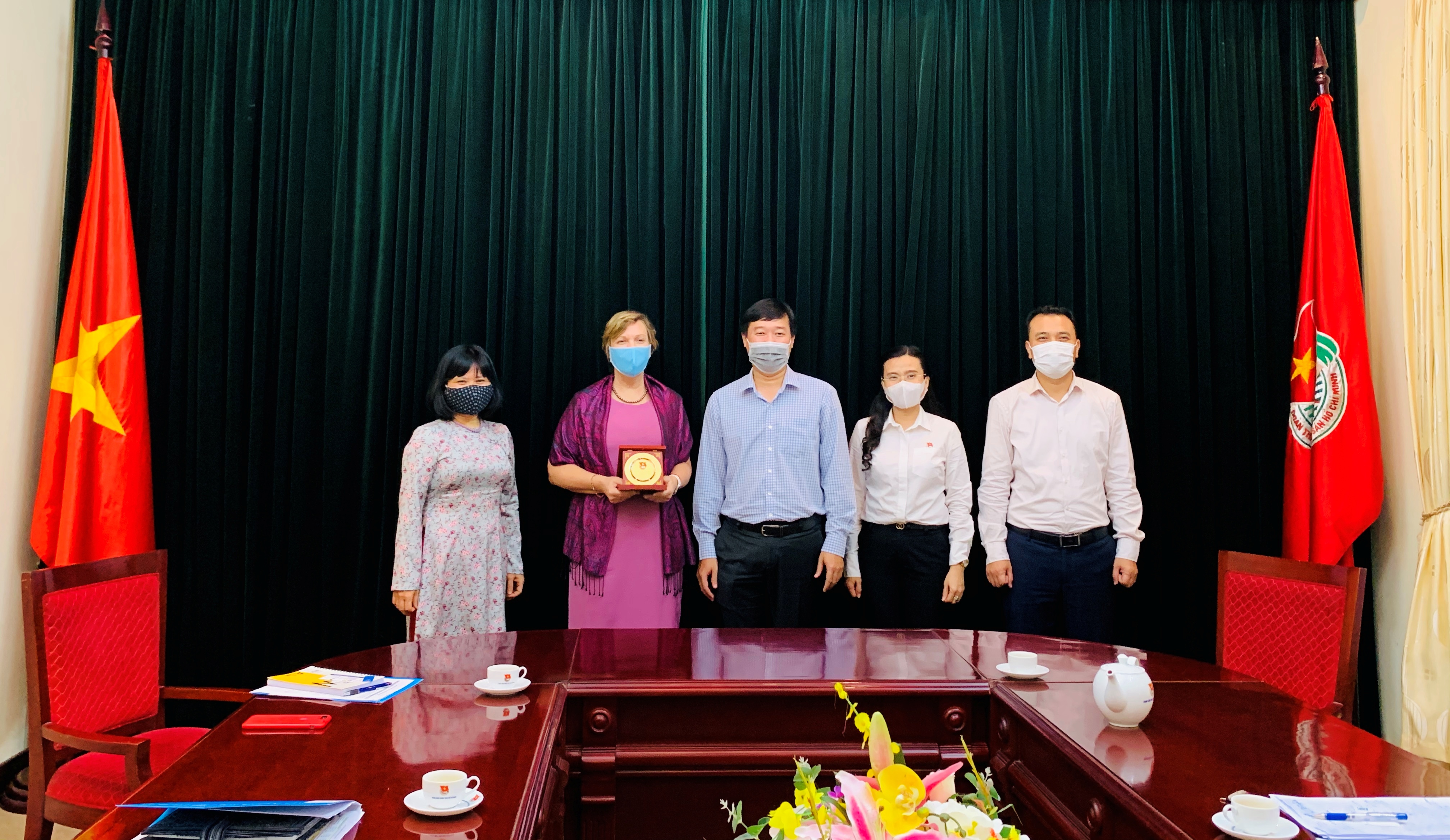 Bí thư thứ nhất Trung ương Đoàn Lê Quốc Phong trao biểu trưng lưu niệm cho bà Rana Flowers, Trưởng Đại diện Quỹ Nhi đồng Liên hợp quốc tại Việt Nam