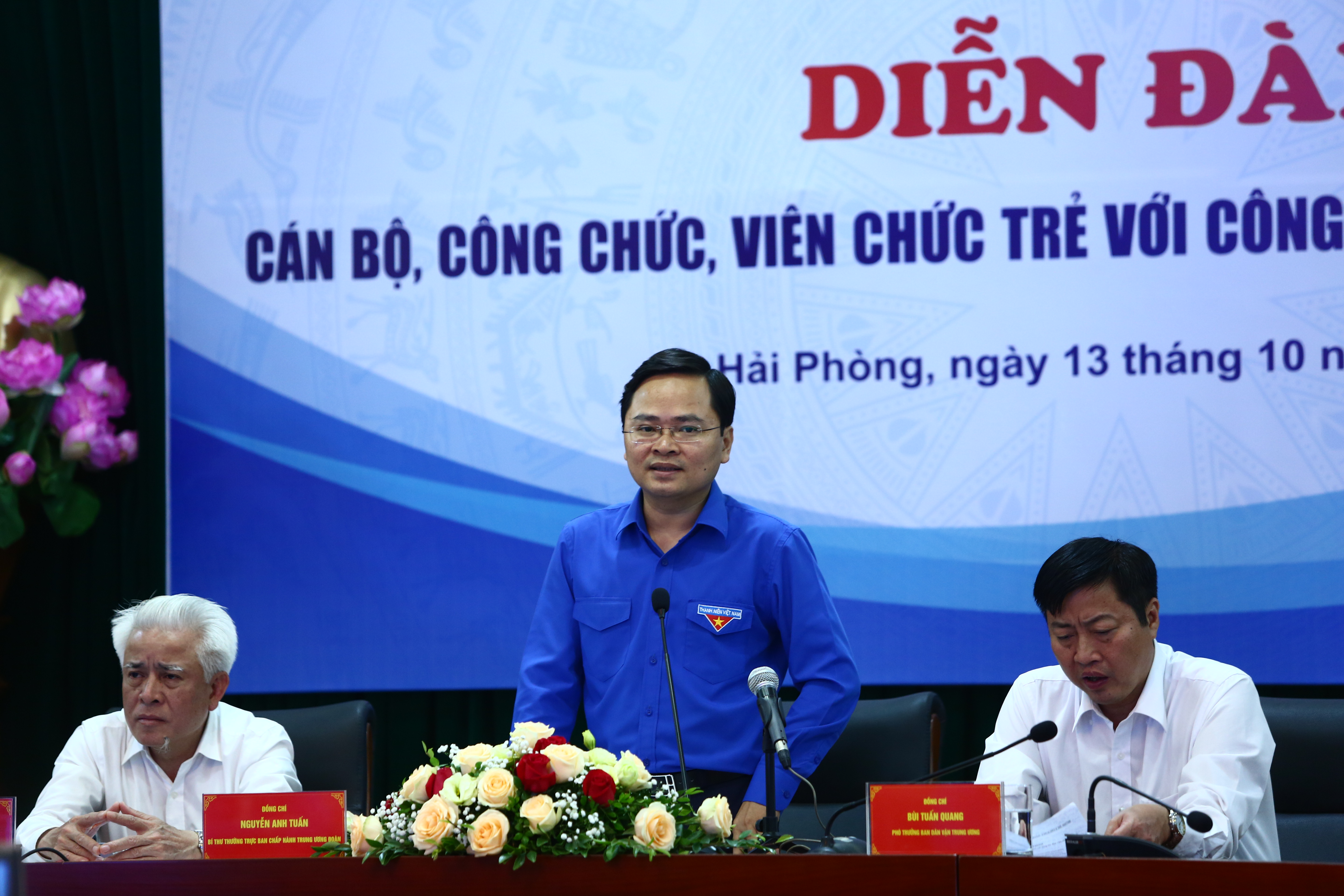 Trong khuôn khổ lễ tuyên dương Giải thưởng Cán bộ, công chức, viên chức trẻ giỏi toàn quốc năm 2019, sáng 13/10, tại Hải Phòng diễn ra diễn đàn “Cán bộ, công chức, viên chức trẻ với công tác dân vận chính quyền”. Đồng chí Bùi Tuấn Quang, Phó Ban Dân vận TƯ; đồng chí Nguyễn Anh Tuấn, Bí thư thường trực TƯ Đoàn đồng chủ trì diễn đàn.
